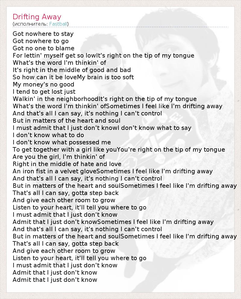 Got nowhere to stay Got nowhere to go Got no one to blame For lettin' myself get so lowIt's right on the tip of my tongue What's the word I'm thinkin' of It's right in the middle of good and bad So how can it be loveMy brain is too soft My money's no good I tend to get lost just Walkin' in the neighborhoodIt's right on the tip of my tongue What's the word I'm thinkin' ofSometimes I feel like I'm drifting away And that's all I can say, it's nothing I can't control But in matters of the heart and soul I must admit that I just don't knowI don't know what to say I don't know what to do I don't know what possessed me To get together with a girl like youYou're right on the tip of my tongue Are you the girl, I'm thinkin' of Right in the middle of hate and love An iron fist in a velvet gloveSometimes I feel like I'm drifting away And that's all I can say, it's nothing I can't control But in matters of the heart and soulSometimes I feel like I'm drifting away That's all I can say, gotta step back And give each other room to grow Listen to your heart, it'll tell you where to go I must admit that I just don't know Admit that I just don't knowSometimes I feel like I'm drifting away And that's all I can say, it's nothing I can't control But in matters of the heart and soulSometimes I feel like I'm drifting away That's all I can say, gotta step back And give each other room to grow Listen to your heart, it'll tell you where to go I must admit that I just don't know Admit that I just don't know Admit that I just don't know