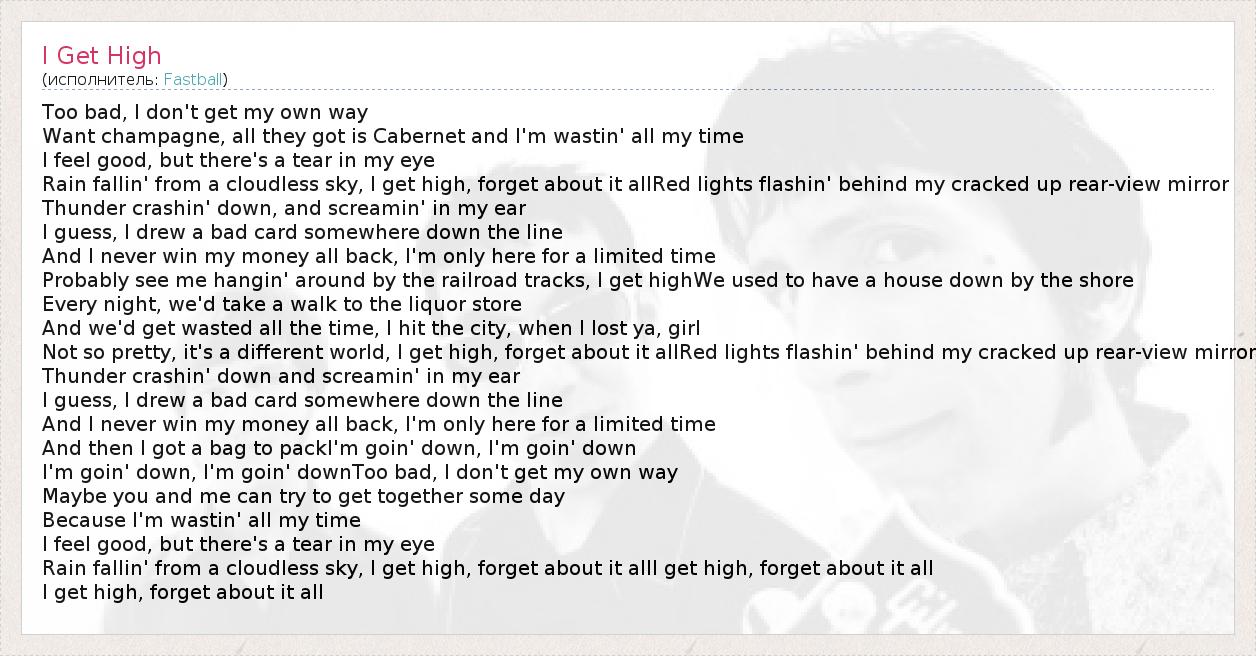 Too bad, I don't get my own way Want champagne, all they got is Cabernet and I'm wastin' all my time I feel good, but there's a tear in my eye Rain fallin' from a cloudless sky, I get high, forget about it allRed lights flashin' behind my cracked up rear-view mirror Thunder crashin' down, and screamin' in my ear I guess, I drew a bad card somewhere down the line And I never win my money all back, I'm only here for a limited time Probably see me hangin' around by the railroad tracks, I get highWe used to have a house down by the shore Every night, we'd take a walk to the liquor store And we'd get wasted all the time, I hit the city, when I lost ya, girl Not so pretty, it's a different world, I get high, forget about it allRed lights flashin' behind my cracked up rear-view mirror Thunder crashin' down and screamin' in my ear I guess, I drew a bad card somewhere down the line And I never win my money all back, I'm only here for a limited time And then I got a bag to packI'm goin' down, I'm goin' down I'm goin' down, I'm goin' downToo bad, I don't get my own way Maybe you and me can try to get together some day Because I'm wastin' all my time I feel good, but there's a tear in my eye Rain fallin' from a cloudless sky, I get high, forget about it allI get high, forget about it all I get high, forget about it all