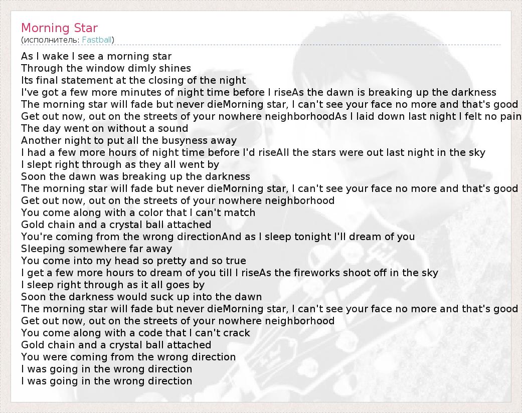 As I wake I see a morning star Through the window dimly shines Its final statement at the closing of the night I've got a few more minutes of night time before I riseAs the dawn is breaking up the darkness The morning star will fade but never dieMorning star, I can't see your face no more and that's good Get out now, out on the streets of your nowhere neighborhoodAs I laid down last night I felt no pain The day went on without a sound Another night to put all the busyness away I had a few more hours of night time before I'd riseAll the stars were out last night in the sky I slept right through as they all went by Soon the dawn was breaking up the darkness The morning star will fade but never dieMorning star, I can't see your face no more and that's good Get out now, out on the streets of your nowhere neighborhood You come along with a color that I can't match Gold chain and a crystal ball attached You're coming from the wrong directionAnd as I sleep tonight I'll dream of you Sleeping somewhere far away You come into my head so pretty and so true I get a few more hours to dream of you till I riseAs the fireworks shoot off in the sky I sleep right through as it all goes by Soon the darkness would suck up into the dawn The morning star will fade but never dieMorning star, I can't see your face no more and that's good Get out now, out on the streets of your nowhere neighborhood You come along with a code that I can't crack Gold chain and a crystal ball attached You were coming from the wrong direction I was going in the wrong direction I was going in the wrong direction