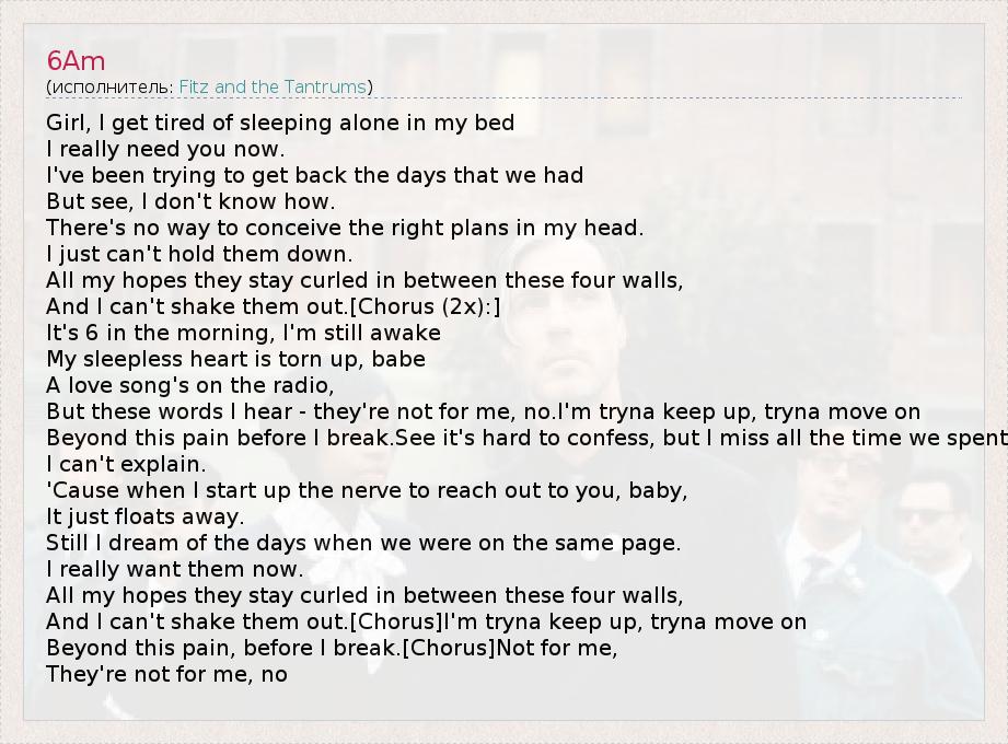 Girl, I get tired of sleeping alone in my bed I really need you now. I've been trying to get back the days that we had But see, I don't know how. There's no way to conceive the right plans in my head. I just can't hold them down. All my hopes they stay curled in between these four walls, And I can't shake them out.[Chorus (2x):] It's 6 in the morning, I'm still awake My sleepless heart is torn up, babe A love song's on the radio, But these words I hear - they're not for me, no.I'm tryna keep up, tryna move on Beyond this pain before I break.See it's hard to confess, but I miss all the time we spent I can't explain. 'Cause when I start up the nerve to reach out to you, baby, It just floats away. Still I dream of the days when we were on the same page. I really want them now. All my hopes they stay curled in between these four walls, And I can't shake them out.[Chorus]I'm tryna keep up, tryna move on Beyond this pain, before I break.[Chorus]Not for me, They're not for me, no