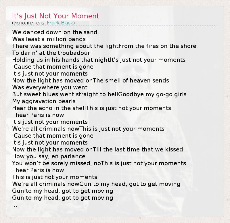 We danced down on the sand Was least a million bands There was something about the lightFrom the fires on the shore To darin' at the troubadour Holding us in his hands that nightIt's just not your moments 'Cause that moment is gone It's just not your moments Now the light has moved onThe smell of heaven sends Was everywhere you went But sweet blues went straight to hellGoodbye my go-go girls My aggravation pearls Hear the echo in the shellThis is just not your moments I hear Paris is now It's just not your moments We're all criminals nowThis is just not your moments 'Cause that moment is gone It's just not your moments Now the light has moved onTill the last time that we kissed How you say, en parlance You won't be sorely missed, noThis is just not your moments I hear Paris is now This is just not your moments We're all criminals nowGun to my head, got to get moving Gun to my head, got to get moving Gun to my head, got to get moving ...