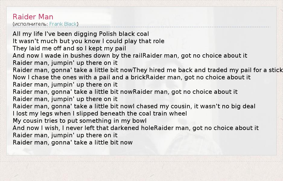 All my life I've been digging Polish black coal It wasn't much but you know I could play that role They laid me off and so I kept my pail And now I wade in bushes down by the railRaider man, got no choice about it Raider man, jumpin' up there on it Raider man, gonna' take a little bit nowThey hired me back and traded my pail for a stick Now I chase the ones with a pail and a brickRaider man, got no choice about it Raider man, jumpin' up there on it Raider man, gonna' take a little bit nowRaider man, got no choice about it Raider man, jumpin' up there on it Raider man, gonna' take a little bit nowI chased my cousin, it wasn't no big deal I lost my legs when I slipped beneath the coal train wheel My cousin tries to put something in my bowl And now I wish, I never left that darkened holeRaider man, got no choice about it Raider man, jumpin' up there on it Raider man, gonna' take a little bit now