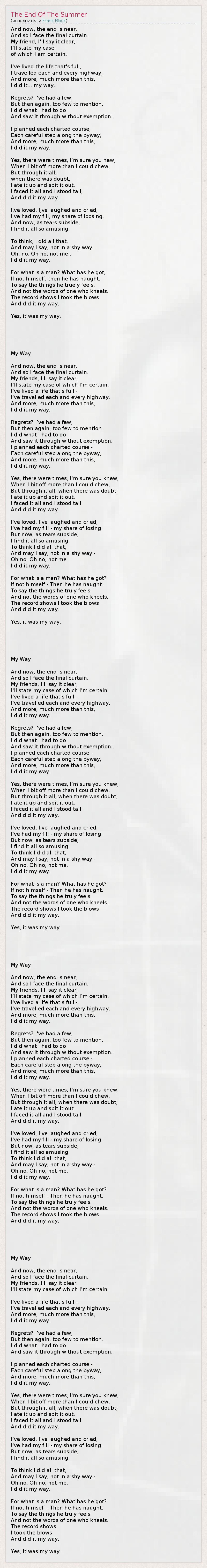 And now, the end is near, And so I face the final curtain. My friend, I'll say it clear, I'll state my case of which I am certain. I've lived the life that's full, I travelled each and every highway, And more, much more than this, I did it... my way. Regrets? I've had a few, But then again, too few to mention. I did what I had to do And saw it through without exemption. I planned each charted course, Each careful step along the byway, And more, much more than this, I did it my way. Yes, there were times, I'm sure you new, When I bit off more than I could chew, But through it all, when there was doubt, I ate it up and spit it out, I faced it all and I stood tall, And did it my way. I,ve loved, I,ve laughed and cried, I,ve had my fill, my share of loosing, And now, as tears subside, I find it all so amusing. To think, I did all that, And may I say, not in a shy way .. Oh, no. Oh no, not me .. I did it my way. For what is a man? What has he got, If not himself, then he has naught. To say the things he truely feels, And not the words of one who kneels. The record shows I took the blows And did it my way. Yes, it was my way. My Way And now, the end is near, And so I face the final curtain. My friends, I'll say it clear, I'll state my case of which I'm certain. I've lived a life that's full - I've travelled each and every highway. And more, much more than this, I did it my way. Regrets? I've had a few, But then again, too few to mention. I did what I had to do And saw it through without exemption. I planned each charted course - Each careful step along the byway, And more, much more than this, I did it my way. Yes, there were times, I'm sure you knew, When I bit off more than I could chew, But through it all, when there was doubt, I ate it up and spit it out. I faced it all and I stood tall And did it my way. I've loved, I've laughed and cried, I've had my fill - my share of losing. But now, as tears subside, I find it all so amusing. To think I did all that, And may I say, not in a shy way - Oh no. Oh no, not me. I did it my way. For what is a man? What has he got? If not himself - Then he has naught. To say the things he truly feels And not the words of one who kneels. The record shows I took the blows And did it my way. Yes, it was my way. My Way And now, the end is near, And so I face the final curtain. My friends, I'll say it clear, I'll state my case of which I'm certain. I've lived a life that's full - I've travelled each and every highway. And more, much more than this, I did it my way. Regrets? I've had a few, But then again, too few to mention. I did what I had to do And saw it through without exemption. I planned each charted course - Each careful step along the byway, And more, much more than this, I did it my way. Yes, there were times, I'm sure you knew, When I bit off more than I could chew, But through it all, when there was doubt, I ate it up and spit it out. I faced it all and I stood tall And did it my way. I've loved, I've laughed and cried, I've had my fill - my share of losing. But now, as tears subside, I find it all so amusing. To think I did all that, And may I say, not in a shy way - Oh no. Oh no, not me. I did it my way. For what is a man? What has he got? If not himself - Then he has naught. To say the things he truly feels And not the words of one who kneels. The record shows I took the blows And did it my way. Yes, it was my way. My Way And now, the end is near, And so I face the final curtain. My friends, I'll say it clear, I'll state my case of which I'm certain. I've lived a life that's full - I've travelled each and every highway. And more, much more than this, I did it my way. Regrets? I've had a few, But then again, too few to mention. I did what I had to do And saw it through without exemption. I planned each charted course - Each careful step along the byway, And more, much more than this, I did it my way. Yes, there were times, I'm sure you knew, When I bit off more than I could chew, But through it all, when there was doubt, I ate it up and spit it out. I faced it all and I stood tall And did it my way. I've loved, I've laughed and cried, I've had my fill - my share of losing. But now, as tears subside, I find it all so amusing. To think I did all that, And may I say, not in a shy way - Oh no. Oh no, not me. I did it my way. For what is a man? What has he got? If not himself - Then he has naught. To say the things he truly feels And not the words of one who kneels. The record shows I took the blows And did it my way. My Way And now, the end is near, And so I face the final curtain. My friends, I'll say it clear I'll state my case of which I'm certain. I've lived a life that's full - I've travelled each and every highway. And more, much more than this, I did it my way. Regrets? I've had a few, But then again, too few to mention. I did what I had to do And saw it through without exemption. I planned each charted course - Each careful step along the byway, And more, much more than this, I did it my way. Yes, there were times, I'm sure you knew, When I bit off more than I could chew, But through it all, when there was doubt, I ate it up and spit it out. I faced it all and I stood tall And did it my way. I've loved, I've laughed and cried, I've had my fill - my share of losing. But now, as tears subside, I find it all so amusing. To think I did all that, And may I say, not in a shy way - Oh no. Oh no, not me. I did it my way. For what is a man? What has he got? If not himself - Then he has naught. To say the things he truly feels And not the words of one who kneels. The record shows I took the blows And did it my way. Yes, it was my way.