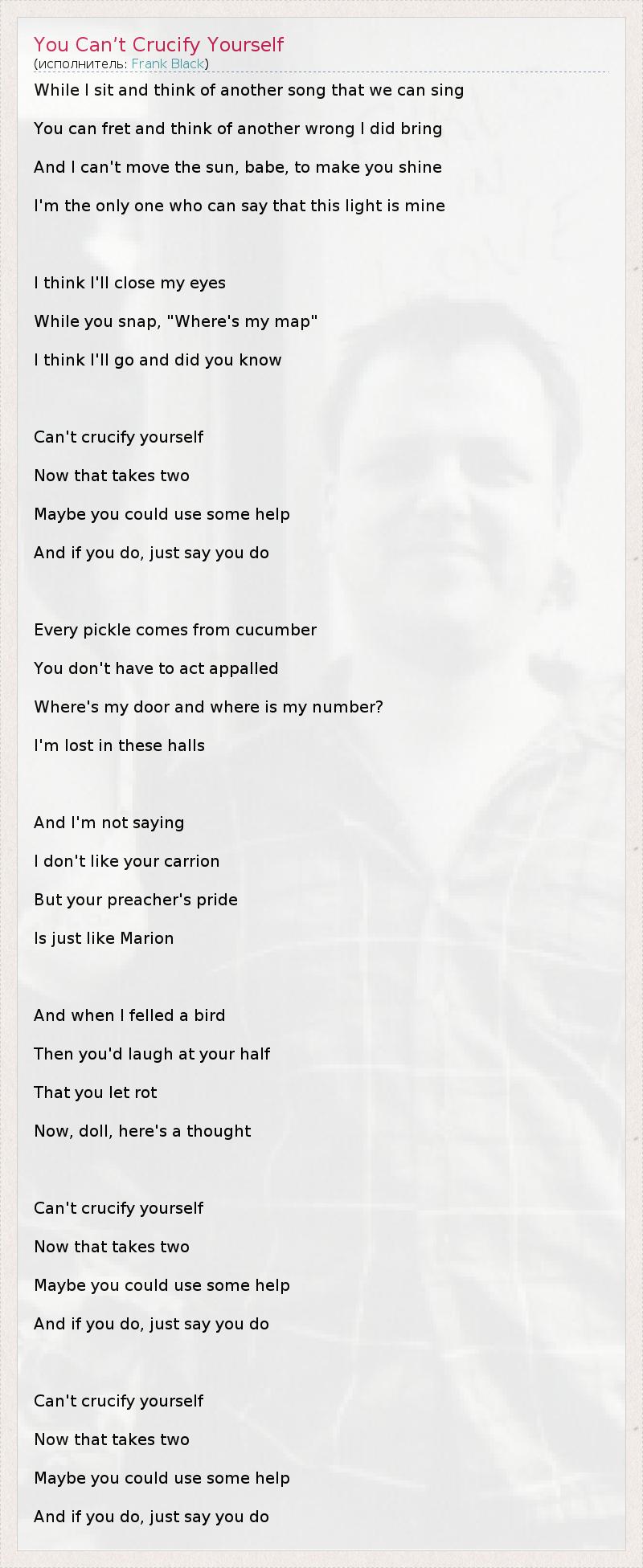 While I sit and think of another song that we can sing You can fret and think of another wrong I did bring And I can't move the sun, babe, to make you shine I'm the only one who can say that this light is mine I think I'll close my eyes While you snap, "Where's my map" I think I'll go and did you know Can't crucify yourself Now that takes two Maybe you could use some help And if you do, just say you do Every pickle comes from cucumber You don't have to act appalled Where's my door and where is my number? I'm lost in these halls And I'm not saying I don't like your carrion But your preacher's pride Is just like Marion And when I felled a bird Then you'd laugh at your half That you let rot Now, doll, here's a thought Can't crucify yourself Now that takes two Maybe you could use some help And if you do, just say you do Can't crucify yourself Now that takes two Maybe you could use some help And if you do, just say you do