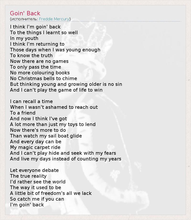 Думаю, я возвращаюсь назад К тем вещам, которые я так хорошо узнал В своей юности. Думаю, я возвращаюсь в Те дни, когда я был молод достаточно Для того, чтобы знать правду. Теперь нет игр лишь для того, Чтобы провести время. Больше нет раскрашенных книг И не звонят Рождественские колокольчики, Но продолжать ощущать себя молодым и при этом стареть - не грех, И я не могу победить в игре с жизнью. Я могу припомнить время, Когда мне не было стыдно обратиться К другу, А сейчас я думаю, у меня есть Гораздо больше, чем просто мои безделушки, чтобы давать их взаймы. Теперь нужно делать больше, Чем просто смотреть, как скользит по воде мой парусник. И каждый день может стать Полетом на ковре-самолете. И я не могу играть в прятки со своими страхами И проживать свои дни вместо того, чтобы считать свои годы. Пусть каждый поразмыслит Над настоящей реальностью. Я бы лучше видел мир Таким, каким он был раньше. Все, чего нам не хватает, это немножечко свободы. Так поймай меня, если сможешь, Я возвращаюсь назад.