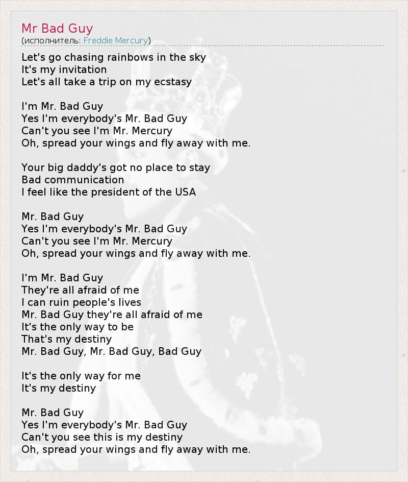 Let's go chasing rainbows in the sky It's my invitation Let's all take a trip on my ecstasy I'm Mr. Bad Guy Yes I'm everybody's Mr. Bad Guy Can't you see I'm Mr. Mercury Oh, spread your wings and fly away with me. Your big daddy's got no place to stay Bad communication I feel like the president of the USA Mr. Bad Guy Yes I'm everybody's Mr. Bad Guy Can't you see I'm Mr. Mercury Oh, spread your wings and fly away with me. I'm Mr. Bad Guy They're all afraid of me I can ruin people's lives Mr. Bad Guy they're all afraid of me It's the only way to be That's my destiny Mr. Bad Guy, Mr. Bad Guy, Bad Guy It's the only way for me It's my destiny Mr. Bad Guy Yes I'm everybody's Mr. Bad Guy Can't you see this is my destiny Oh, spread your wings and fly away with me.