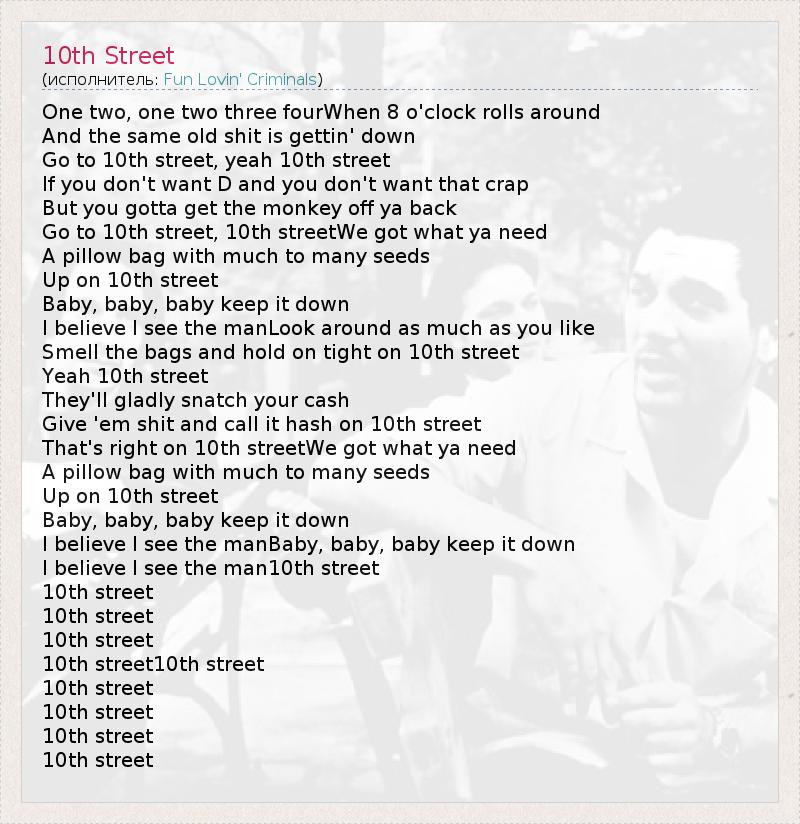 One two, one two three fourWhen 8 o'clock rolls around And the same old shit is gettin' down Go to 10th street, yeah 10th street If you don't want D and you don't want that crap But you gotta get the monkey off ya back Go to 10th street, 10th streetWe got what ya need A pillow bag with much to many seeds Up on 10th street Baby, baby, baby keep it down I believe I see the manLook around as much as you like Smell the bags and hold on tight on 10th street Yeah 10th street They'll gladly snatch your cash Give 'em shit and call it hash on 10th street That's right on 10th streetWe got what ya need A pillow bag with much to many seeds Up on 10th street Baby, baby, baby keep it down I believe I see the manBaby, baby, baby keep it down I believe I see the man10th street 10th street 10th street 10th street 10th street10th street 10th street 10th street 10th street 10th street