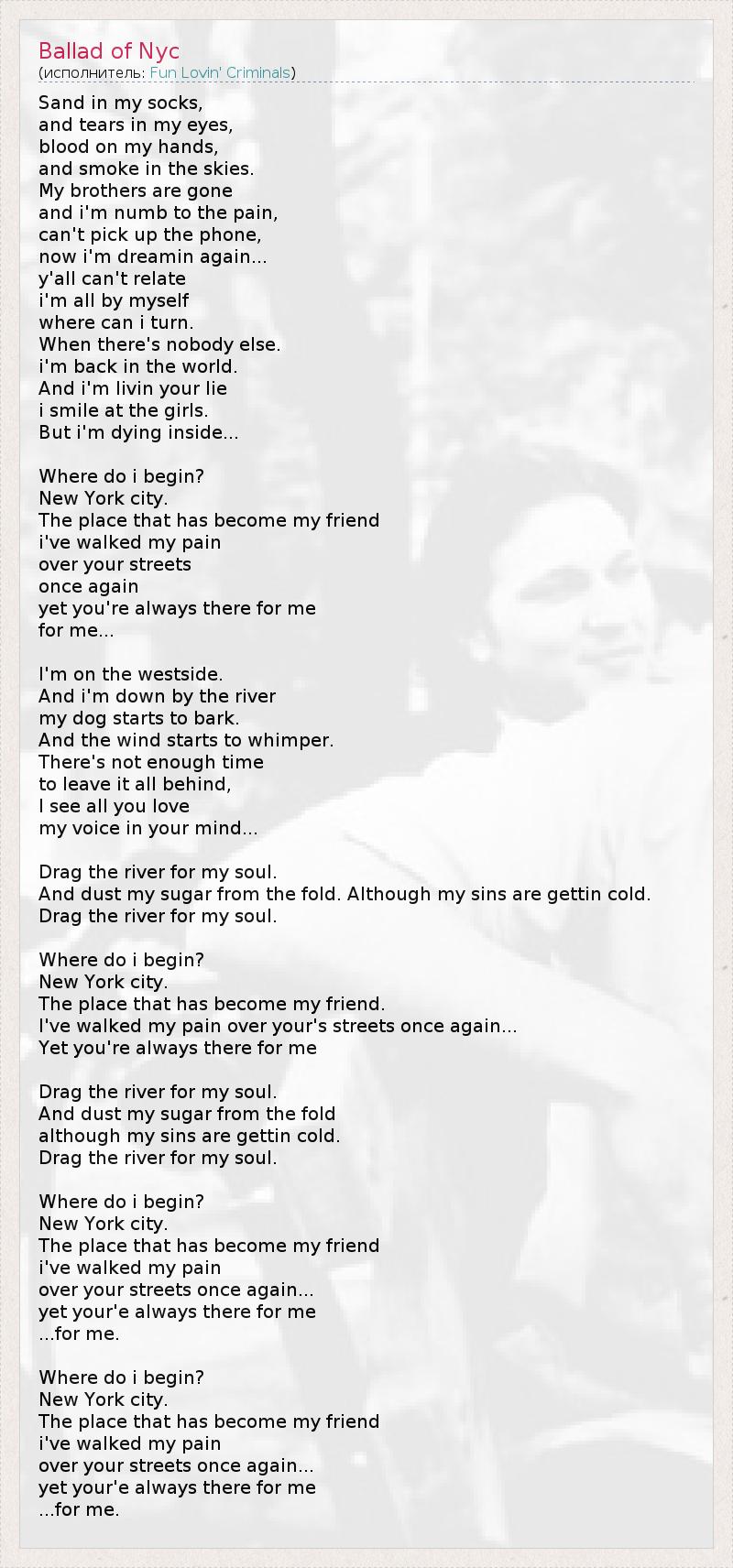 Sand in my socks, and tears in my eyes, blood on my hands, and smoke in the skies. My brothers are gone and i'm numb to the pain, can't pick up the phone, now i'm dreamin again... y'all can't relate i'm all by myself where can i turn. When there's nobody else. i'm back in the world. And i'm livin your lie i smile at the girls. But i'm dying inside... Where do i begin? New York city. The place that has become my friend i've walked my pain over your streets once again yet you're always there for me for me... I'm on the westside. And i'm down by the river my dog starts to bark. And the wind starts to whimper. There's not enough time to leave it all behind, I see all you love my voice in your mind... Drag the river for my soul. And dust my sugar from the fold. Although my sins are gettin cold. Drag the river for my soul. Where do i begin? New York city. The place that has become my friend. I've walked my pain over your's streets once again... Yet you're always there for me Drag the river for my soul. And dust my sugar from the fold although my sins are gettin cold. Drag the river for my soul. Where do i begin? New York city. The place that has become my friend i've walked my pain over your streets once again... yet your'e always there for me ...for me. Where do i begin? New York city. The place that has become my friend i've walked my pain over your streets once again... yet your'e always there for me ...for me.