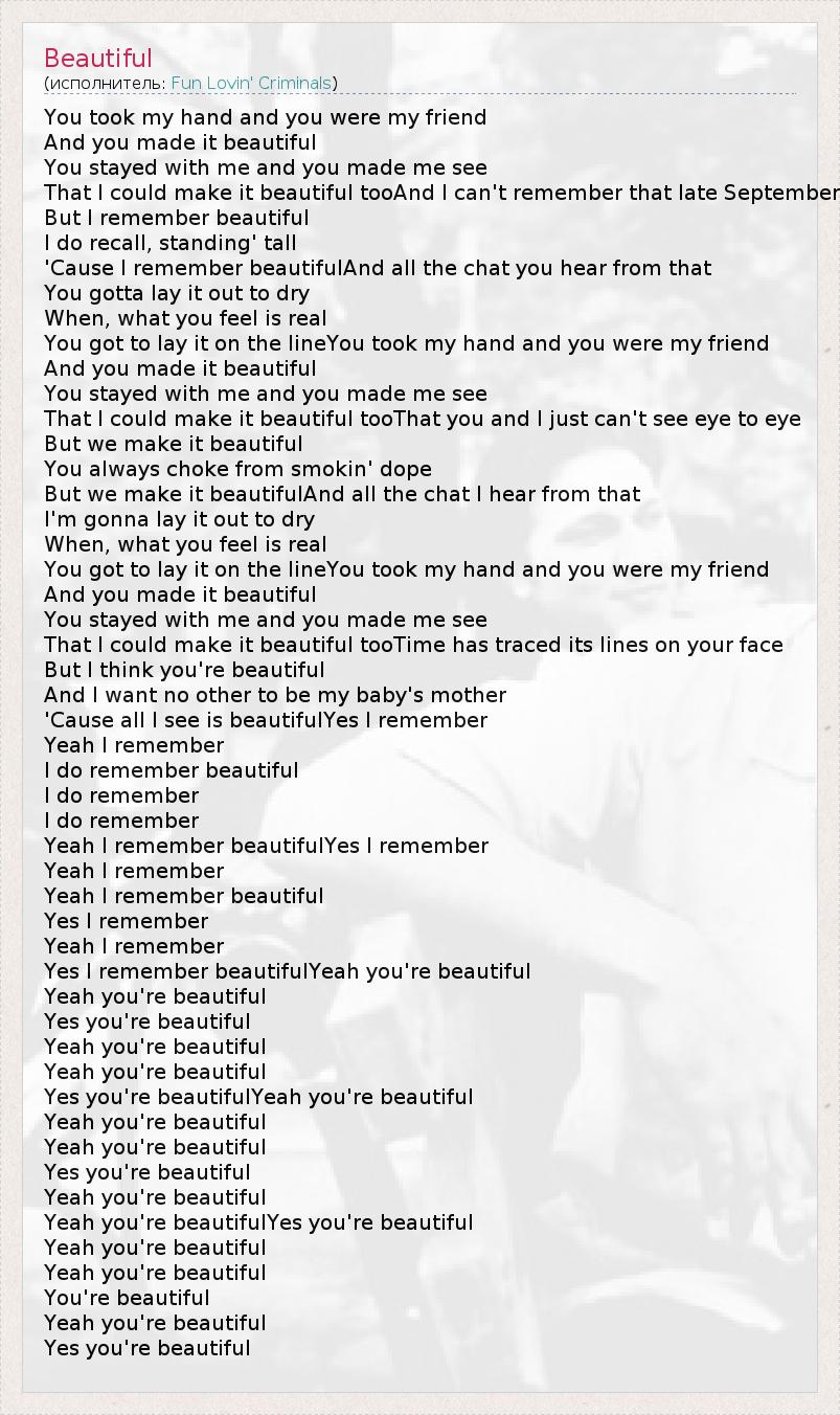 You took my hand and you were my friend And you made it beautiful You stayed with me and you made me see That I could make it beautiful tooAnd I can't remember that late September But I remember beautiful I do recall, standing' tall 'Cause I remember beautifulAnd all the chat you hear from that You gotta lay it out to dry When, what you feel is real You got to lay it on the lineYou took my hand and you were my friend And you made it beautiful You stayed with me and you made me see That I could make it beautiful tooThat you and I just can't see eye to eye But we make it beautiful You always choke from smokin' dope But we make it beautifulAnd all the chat I hear from that I'm gonna lay it out to dry When, what you feel is real You got to lay it on the lineYou took my hand and you were my friend And you made it beautiful You stayed with me and you made me see That I could make it beautiful tooTime has traced its lines on your face But I think you're beautiful And I want no other to be my baby's mother 'Cause all I see is beautifulYes I remember Yeah I remember I do remember beautiful I do remember I do remember Yeah I remember beautifulYes I remember Yeah I remember Yeah I remember beautiful Yes I remember Yeah I remember Yes I remember beautifulYeah you're beautiful Yeah you're beautiful Yes you're beautiful Yeah you're beautiful Yeah you're beautiful Yes you're beautifulYeah you're beautiful Yeah you're beautiful Yeah you're beautiful Yes you're beautiful Yeah you're beautiful Yeah you're beautifulYes you're beautiful Yeah you're beautiful Yeah you're beautiful You're beautiful Yeah you're beautiful Yes you're beautiful
