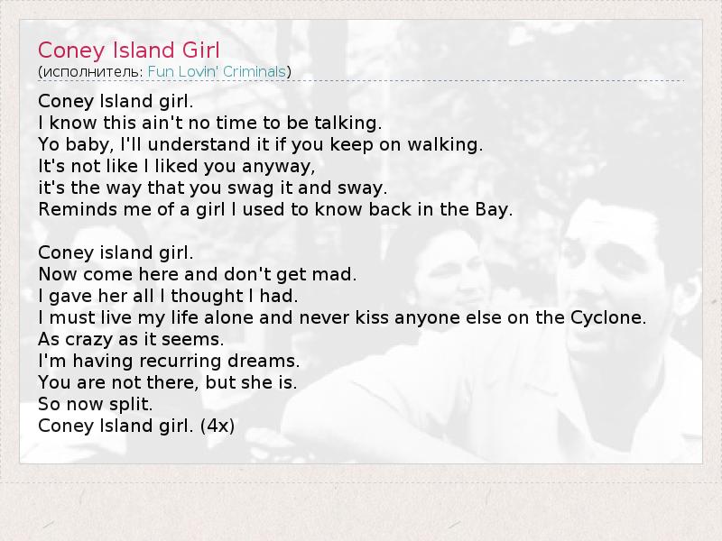 А как ты думаешь, о чем песня "Coney Island Girl" ?
