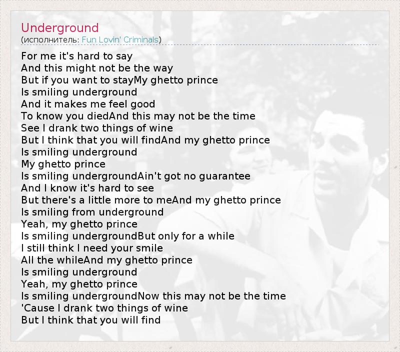 For me it's hard to say And this might not be the way But if you want to stayMy ghetto prince Is smiling underground And it makes me feel good To know you diedAnd this may not be the time See I drank two things of wine But I think that you will findAnd my ghetto prince Is smiling underground My ghetto prince Is smiling undergroundAin't got no guarantee And I know it's hard to see But there's a little more to meAnd my ghetto prince Is smiling from underground Yeah, my ghetto prince Is smiling undergroundBut only for a while I still think I need your smile All the whileAnd my ghetto prince Is smiling underground Yeah, my ghetto prince Is smiling undergroundNow this may not be the time 'Cause I drank two things of wine But I think that you will find