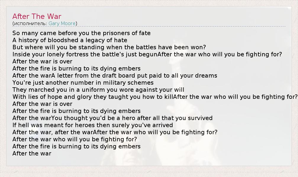 With lies of hope and glory they taught you how to killAfter the war who will you be fighting for?