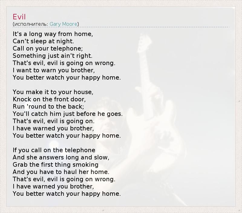 It's a long way from home, Can't sleep at night. Call on your telephone; Something just ain't right. That's evil, evil is going on wrong. I want to warn you brother, You better watch your happy home. You make it to your house, Knock on the front door, Run 'round to the back; You'll catch him just before he goes. That's evil, evil is going on. I have warned you brother, You better watch your happy home. If you call on the telephone And she answers long and slow, Grab the first thing smoking And you have to haul her home. That's evil, evil is going on wrong. I have warned you brother, You better watch your happy home.