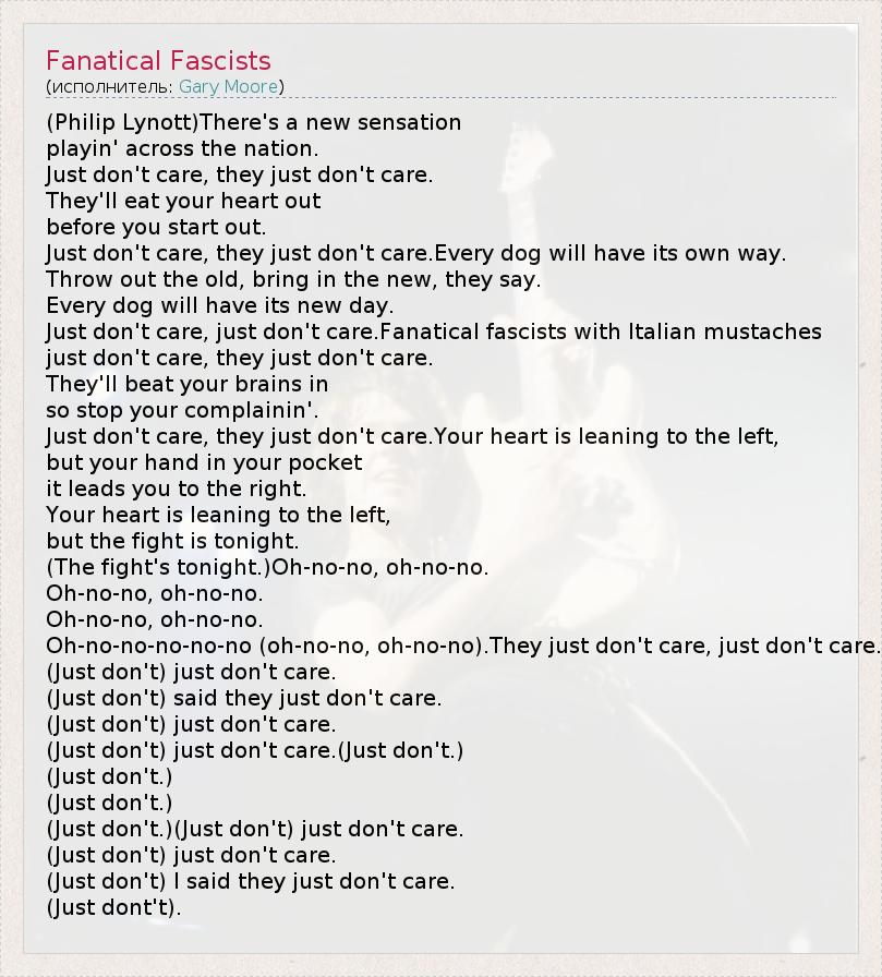 Just don't care, just don't care.Fanatical fascists with Italian mustaches