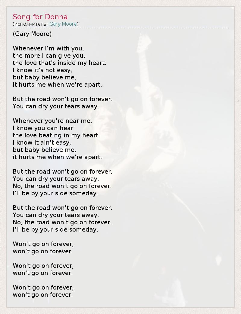 (Gary Moore) Whenever I'm with you, the more I can give you, the love that's inside my heart. I know it's not easy, but baby believe me, it hurts me when we're apart. But the road won't go on forever. You can dry your tears away. Whenever you're near me, I know you can hear the love beating in my heart. I know it ain't easy, but baby believe me, it hurts me when we're apart. But the road won't go on forever. You can dry your tears away. No, the road won't go on forever. I'll be by your side someday. But the road won't go on forever. You can dry your tears away. No, the road won't go on forever. I'll be by your side someday. Won't go on forever, won't go on forever. Won't go on forever, won't go on forever. Won't go on forever, won't go on forever.