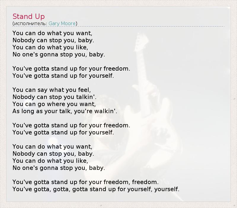 You can do what you want, Nobody can stop you, baby. You can do what you like, No one's gonna stop you, baby. You've gotta stand up for your freedom. You've gotta stand up for yourself. You can say what you feel, Nobody can stop you talkin'. You can go where you want, As long as your talk, you're walkin'. You've gotta stand up for your freedom. You've gotta stand up for yourself. You can do what you want, Nobody can stop you, baby. You can do what you like, No one's gonna stop you, baby. You've gotta stand up for your freedom, freedom. You've gotta, gotta, gotta stand up for yourself, yourself.