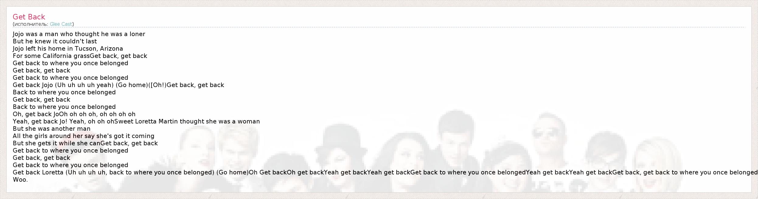Get back Loretta (Uh uh uh uh, back to where you once belonged) (Go home)Oh Get backOh get backYeah get backYeah get backGet back to where you once belongedYeah get backYeah get backGet back, get back to where you once belonged