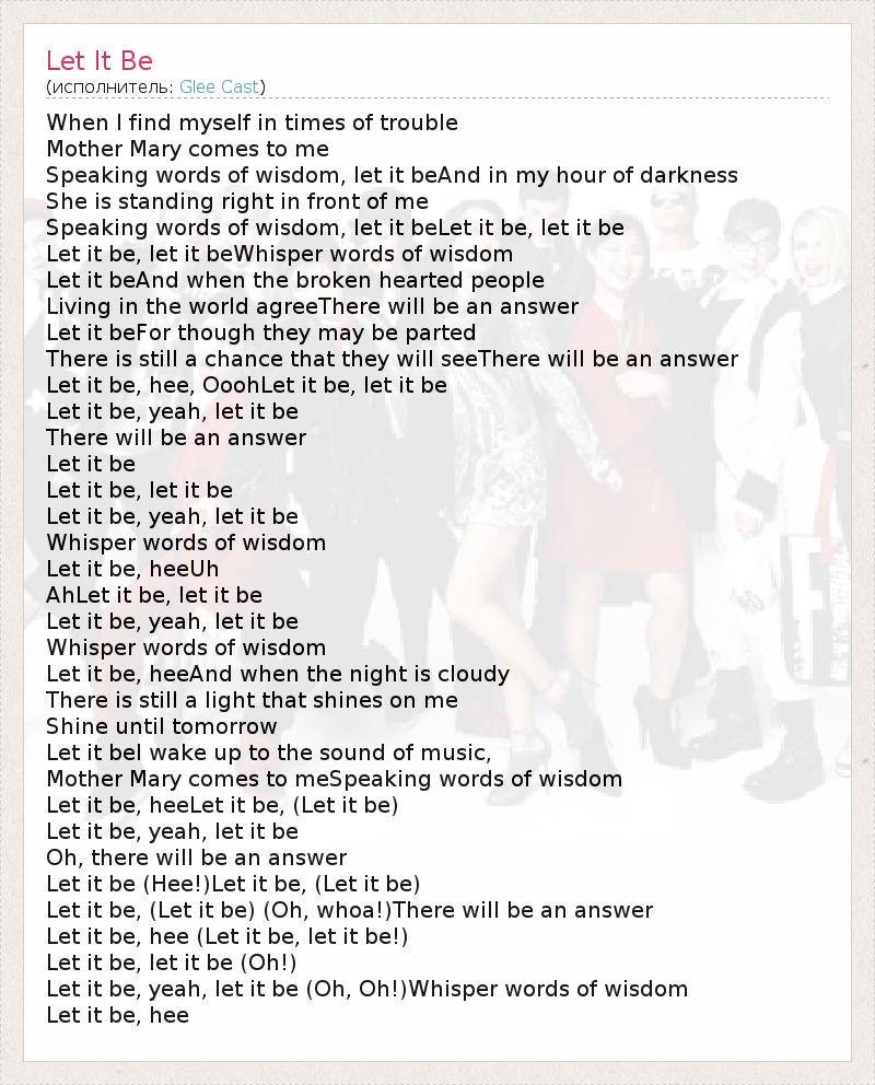 When I find myself in times of trouble Mother Mary comes to me Speaking words of wisdom, let it beAnd in my hour of darkness She is standing right in front of me Speaking words of wisdom, let it beLet it be, let it be Let it be, let it beWhisper words of wisdom Let it beAnd when the broken hearted people Living in the world agreeThere will be an answer Let it beFor though they may be parted There is still a chance that they will seeThere will be an answer Let it be, hee, OoohLet it be, let it be Let it be, yeah, let it be There will be an answer Let it be Let it be, let it be Let it be, yeah, let it be Whisper words of wisdom Let it be, heeUh AhLet it be, let it be Let it be, yeah, let it be Whisper words of wisdom Let it be, heeAnd when the night is cloudy There is still a light that shines on me Shine until tomorrow Let it beI wake up to the sound of music, Mother Mary comes to meSpeaking words of wisdom Let it be, heeLet it be, (Let it be) Let it be, yeah, let it be Oh, there will be an answer Let it be (Hee!)Let it be, (Let it be) Let it be, (Let it be) (Oh, whoa!)There will be an answer Let it be, hee (Let it be, let it be!) Let it be, let it be (Oh!) Let it be, yeah, let it be (Oh, Oh!)Whisper words of wisdom Let it be, hee
