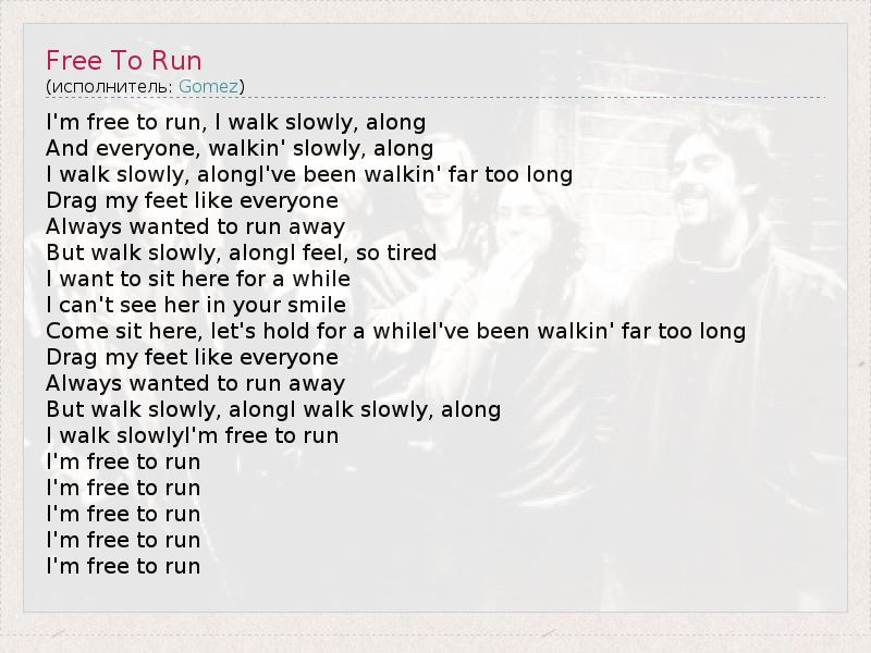 I'm free to run, I walk slowly, along And everyone, walkin' slowly, along I walk slowly, alongI've been walkin' far too long Drag my feet like everyone Always wanted to run away But walk slowly, alongI feel, so tired I want to sit here for a while I can't see her in your smile Come sit here, let's hold for a whileI've been walkin' far too long Drag my feet like everyone Always wanted to run away But walk slowly, alongI walk slowly, along I walk slowlyI'm free to run I'm free to run I'm free to run I'm free to run I'm free to run I'm free to run