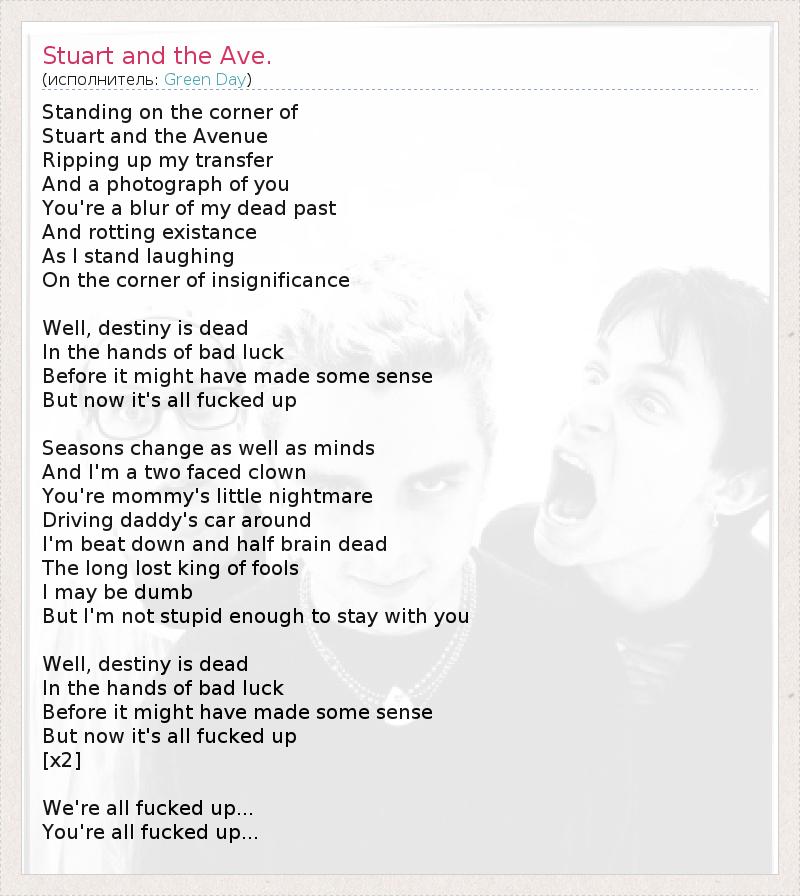 Standing on the corner of Stuart and the Avenue Ripping up my transfer And a photograph of you You're a blur of my dead past And rotting existance As I stand laughing On the corner of insignificance Well, destiny is dead In the hands of bad luck Before it might have made some sense But now it's all fucked up Seasons change as well as minds And I'm a two faced clown You're mommy's little nightmare Driving daddy's car around I'm beat down and half brain dead The long lost king of fools I may be dumb But I'm not stupid enough to stay with you Well, destiny is dead In the hands of bad luck Before it might have made some sense But now it's all fucked up [x2] We're all fucked up... You're all fucked up...