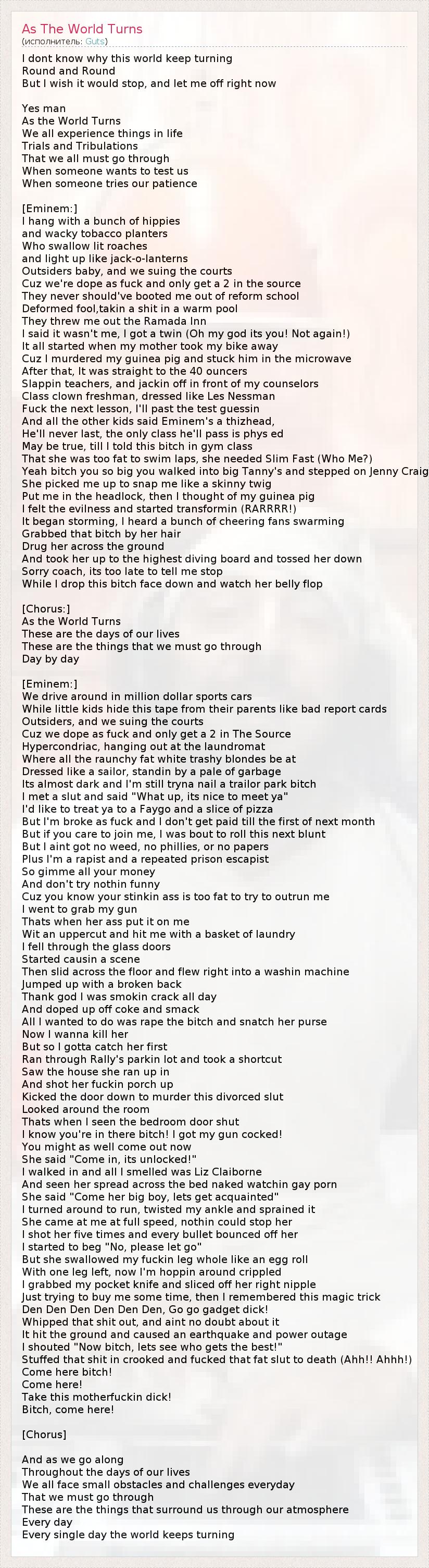 I dont know why this world keep turning Round and Round But I wish it would stop, and let me off right now Yes man As the World Turns We all experience things in life Trials and Tribulations That we all must go through When someone wants to test us When someone tries our patience [Eminem:] I hang with a bunch of hippies and wacky tobacco planters Who swallow lit roaches and light up like jack-o-lanterns Outsiders baby, and we suing the courts Cuz we're dope as fuck and only get a 2 in the source They never should've booted me out of reform school Deformed fool,takin a shit in a warm pool They threw me out the Ramada Inn I said it wasn't me, I got a twin (Oh my god its you! Not again!) It all started when my mother took my bike away Cuz I murdered my guinea pig and stuck him in the microwave After that, It was straight to the 40 ouncers Slappin teachers, and jackin off in front of my counselors Class clown freshman, dressed like Les Nessman Fuck the next lesson, I'll past the test guessin And all the other kids said Eminem's a thizhead, He'll never last, the only class he'll pass is phys ed May be true, till I told this bitch in gym class That she was too fat to swim laps, she needed Slim Fast (Who Me?) Yeah bitch you so big you walked into big Tanny's and stepped on Jenny Craig She picked me up to snap me like a skinny twig Put me in the headlock, then I thought of my guinea pig I felt the evilness and started transformin (RARRRR!) It began storming, I heard a bunch of cheering fans swarming Grabbed that bitch by her hair Drug her across the ground And took her up to the highest diving board and tossed her down Sorry coach, its too late to tell me stop While I drop this bitch face down and watch her belly flop [Chorus:] As the World Turns These are the days of our lives These are the things that we must go through Day by day [Eminem:] We drive around in million dollar sports cars While little kids hide this tape from their parents like bad report cards Outsiders, and we suing the courts Cuz we dope as fuck and only get a 2 in The Source Hypercondriac, hanging out at the laundromat Where all the raunchy fat white trashy blondes be at Dressed like a sailor, standin by a pale of garbage Its almost dark and I'm still tryna nail a trailor park bitch I met a slut and said "What up, its nice to meet ya" I'd like to treat ya to a Faygo and a slice of pizza But I'm broke as fuck and I don't get paid till the first of next month But if you care to join me, I was bout to roll this next blunt But I aint got no weed, no phillies, or no papers Plus I'm a rapist and a repeated prison escapist So gimme all your money And don't try nothin funny Cuz you know your stinkin ass is too fat to try to outrun me I went to grab my gun Thats when her ass put it on me Wit an uppercut and hit me with a basket of laundry I fell through the glass doors Started causin a scene Then slid across the floor and flew right into a washin machine Jumped up with a broken back Thank god I was smokin crack all day And doped up off coke and smack All I wanted to do was rape the bitch and snatch her purse Now I wanna kill her But so I gotta catch her first Ran through Rally's parkin lot and took a shortcut Saw the house she ran up in And shot her fuckin porch up Kicked the door down to murder this divorced slut Looked around the room Thats when I seen the bedroom door shut I know you're in there bitch! I got my gun cocked! You might as well come out now She said "Come in, its unlocked!" I walked in and all I smelled was Liz Claiborne And seen her spread across the bed naked watchin gay porn She said "Come her big boy, lets get acquainted" I turned around to run, twisted my ankle and sprained it She came at me at full speed, nothin could stop her I shot her five times and every bullet bounced off her I started to beg "No, please let go" But she swallowed my fuckin leg whole like an egg roll With one leg left, now I'm hoppin around crippled I grabbed my pocket knife and sliced off her right nipple Just trying to buy me some time, then I remembered this magic trick Den Den Den Den Den Den, Go go gadget dick! Whipped that shit out, and aint no doubt about it It hit the ground and caused an earthquake and power outage I shouted "Now bitch, lets see who gets the best!" Stuffed that shit in crooked and fucked that fat slut to death (Ahh!! Ahhh!) Come here bitch! Come here! Take this motherfuckin dick! Bitch, come here! [Chorus] And as we go along Throughout the days of our lives We all face small obstacles and challenges everyday That we must go through These are the things that surround us through our atmosphere Every day Every single day the world keeps turning