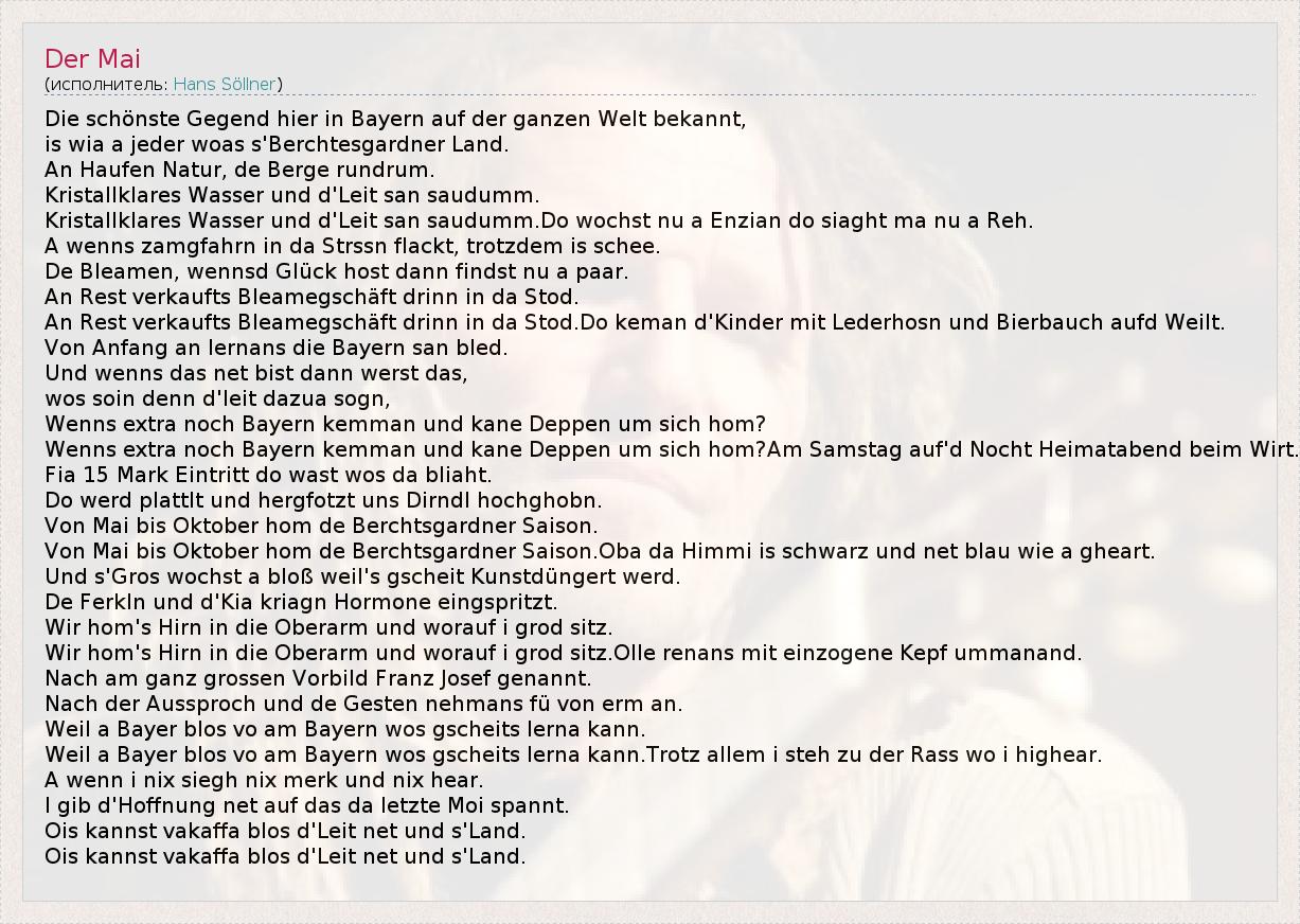 Die schönste Gegend hier in Bayern auf der ganzen Welt bekannt, is wia a jeder woas s'Berchtesgardner Land. An Haufen Natur, de Berge rundrum. Kristallklares Wasser und d'Leit san saudumm. Kristallklares Wasser und d'Leit san saudumm.Do wochst nu a Enzian do siaght ma nu a Reh. A wenns zamgfahrn in da Strssn flackt, trotzdem is schee. De Bleamen, wennsd Glück host dann findst nu a paar. An Rest verkaufts Bleamegschäft drinn in da Stod. An Rest verkaufts Bleamegschäft drinn in da Stod.Do keman d'Kinder mit Lederhosn und Bierbauch aufd Weilt. Von Anfang an lernans die Bayern san bled. Und wenns das net bist dann werst das, wos soin denn d'leit dazua sogn, Wenns extra noch Bayern kemman und kane Deppen um sich hom? Wenns extra noch Bayern kemman und kane Deppen um sich hom?Am Samstag auf'd Nocht Heimatabend beim Wirt. Fia 15 Mark Eintritt do wast wos da bliaht. Do werd plattlt und hergfotzt uns Dirndl hochghobn. Von Mai bis Oktober hom de Berchtsgardner Saison. Von Mai bis Oktober hom de Berchtsgardner Saison.Oba da Himmi is schwarz und net blau wie a gheart. Und s'Gros wochst a bloß weil's gscheit Kunstdüngert werd. De Ferkln und d'Kia kriagn Hormone eingspritzt. Wir hom's Hirn in die Oberarm und worauf i grod sitz. Wir hom's Hirn in die Oberarm und worauf i grod sitz.Olle renans mit einzogene Kepf ummanand. Nach am ganz grossen Vorbild Franz Josef genannt. Nach der Aussproch und de Gesten nehmans fü von erm an. Weil a Bayer blos vo am Bayern wos gscheits lerna kann. Weil a Bayer blos vo am Bayern wos gscheits lerna kann.Trotz allem i steh zu der Rass wo i highear. A wenn i nix siegh nix merk und nix hear. I gib d'Hoffnung net auf das da letzte Moi spannt. Ois kannst vakaffa blos d'Leit net und s'Land. Ois kannst vakaffa blos d'Leit net und s'Land.