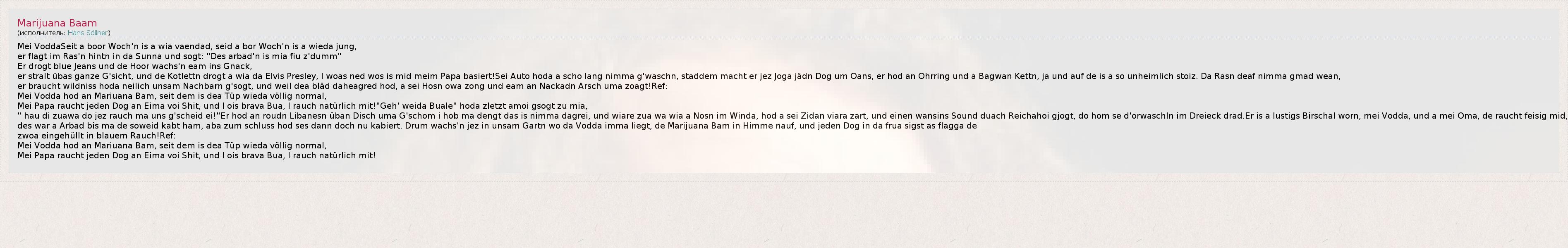 Mei VoddaSeit a boor Woch'n is a wia vaendad, seid a bor Woch'n is a wieda jung, er flagt im Ras'n hintn in da Sunna und sogt: "Des arbad'n is mia fiu z'dumm" Er drogt blue Jeans und de Hoor wachs'n eam ins Gnack, er stralt übas ganze G'sicht, und de Kotlettn drogt a wia da Elvis Presley, I woas ned wos is mid meim Papa basiert!Sei Auto hoda a scho lang nimma g'waschn, staddem macht er jez Joga jädn Dog um Oans, er hod an Ohrring und a Bagwan Kettn, ja und auf de is a so unheimlich stoiz. Da Rasn deaf nimma gmad wean, er braucht wildniss hoda neilich unsam Nachbarn g'sogt, und weil dea bläd daheagred hod, a sei Hosn owa zong und eam an Nackadn Arsch uma zoagt!Ref: Mei Vodda hod an Mariuana Bam, seit dem is dea Tüp wieda völlig normal, Mei Papa raucht jeden Dog an Eima voi Shit, und I ois brava Bua, I rauch natürlich mit!"Geh' weida Buale" hoda zletzt amoi gsogt zu mia, " hau di zuawa do jez rauch ma uns g'scheid ei!"Er hod an roudn Libanesn üban Disch uma G'schom i hob ma dengt das is nimma dagrei, und wiare zua wa wia a Nosn im Winda, hod a sei Zidan viara zart, und einen wansins Sound duach Reichahoi gjogt, do hom se d'orwaschln im Dreieck drad.Er is a lustigs Birschal worn, mei Vodda, und a mei Oma, de raucht feisig mid, des war a Arbad bis ma de soweid kabt ham, aba zum schluss hod ses dann doch nu kabiert. Drum wachs'n jez in unsam Gartn wo da Vodda imma liegt, de Marijuana Bam in Himme nauf, und jeden Dog in da frua sigst as flagga de zwoa eingehüllt in blauem Rauch!Ref: Mei Vodda hod an Mariuana Bam, seit dem is dea Tüp wieda völlig normal, Mei Papa raucht jeden Dog an Eima voi Shit, und I ois brava Bua, I rauch natürlich mit!