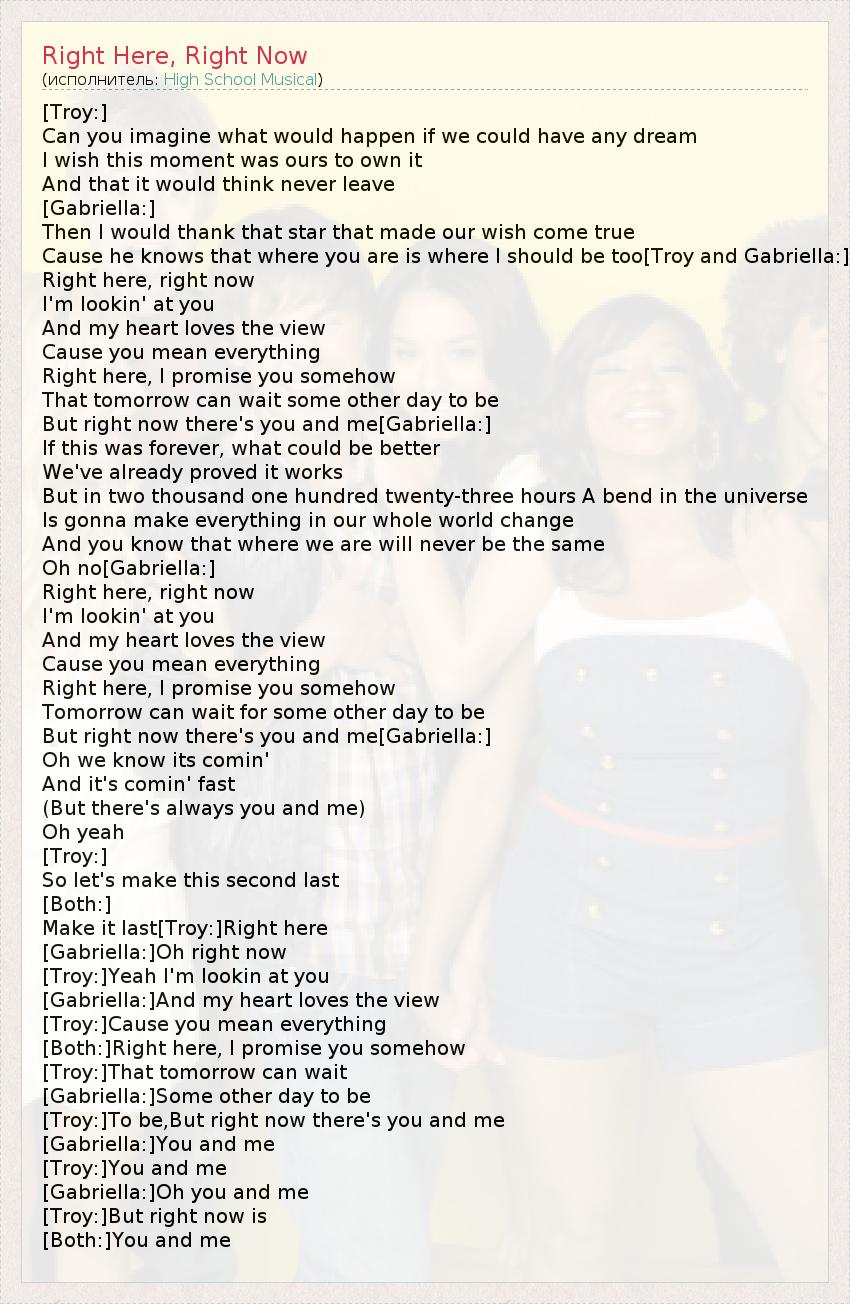 [Troy:] Can you imagine what would happen if we could have any dream I wish this moment was ours to own it And that it would think never leave [Gabriella:] Then I would thank that star that made our wish come true Cause he knows that where you are is where I should be too[Troy and Gabriella:] Right here, right now I'm lookin' at you And my heart loves the view Cause you mean everything Right here, I promise you somehow That tomorrow can wait some other day to be But right now there's you and me[Gabriella:] If this was forever, what could be better We've already proved it works But in two thousand one hundred twenty-three hours A bend in the universe Is gonna make everything in our whole world change And you know that where we are will never be the same Oh no[Gabriella:] Right here, right now I'm lookin' at you And my heart loves the view Cause you mean everything Right here, I promise you somehow Tomorrow can wait for some other day to be But right now there's you and me[Gabriella:] Oh we know its comin' And it's comin' fast (But there's always you and me) Oh yeah [Troy:] So let's make this second last [Both:] Make it last[Troy:]Right here [Gabriella:]Oh right now [Troy:]Yeah I'm lookin at you [Gabriella:]And my heart loves the view [Troy:]Cause you mean everything [Both:]Right here, I promise you somehow [Troy:]That tomorrow can wait [Gabriella:]Some other day to be [Troy:]To be,But right now there's you and me [Gabriella:]You and me [Troy:]You and me [Gabriella:]Oh you and me [Troy:]But right now is [Both:]You and me