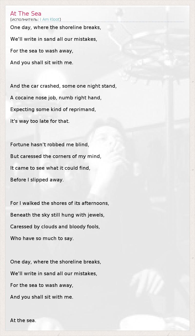 One day, where the shoreline breaks, We'll write in sand all our mistakes, For the sea to wash away, And you shall sit with me. And the car crashed, some one night stand, A cocaine nose job, numb right hand, Expecting some kind of reprimand, It's way too late for that. Fortune hasn't robbed me blind, But caressed the corners of my mind, It came to see what it could find, Before I slipped away. For I walked the shores of its afternoons, Beneath the sky still hung with jewels, Caressed by clouds and bloody fools, Who have so much to say. One day, where the shoreline breaks, We'll write in sand all our mistakes, For the sea to wash away, And you shall sit with me. At the sea.