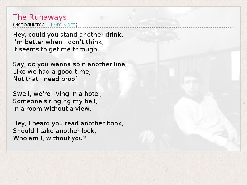 Эй, ты не против выпить еще по одной? Мне лучше не думать, Это вроде помогает справляться. Скажи, может хочешь наплести какую-нибудь историю О том, как здорово мы проводили время, Мне-то можно ничего не доказывать. Важные такие, живем в отеле, А кто-то звонит в звонок, В нашу комнату без окон. Эй, я слышал, ты прочел еще какую-то книгу, Может, мне стоит по-другому взглянуть на то, Кто я есть без тебя?