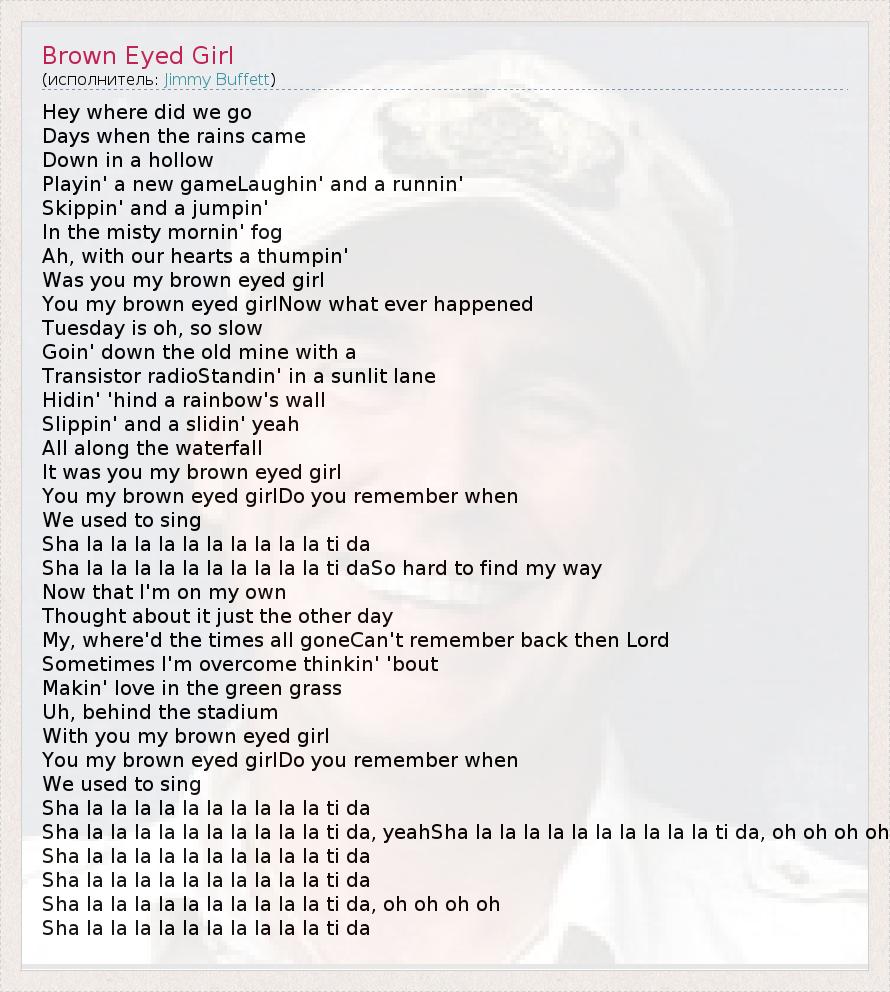 Hey where did we go Days when the rains came Down in a hollow Playin' a new gameLaughin' and a runnin' Skippin' and a jumpin' In the misty mornin' fog Ah, with our hearts a thumpin' Was you my brown eyed girl You my brown eyed girlNow what ever happened Tuesday is oh, so slow Goin' down the old mine with a Transistor radioStandin' in a sunlit lane Hidin' 'hind a rainbow's wall Slippin' and a slidin' yeah All along the waterfall It was you my brown eyed girl You my brown eyed girlDo you remember when We used to sing Sha la la la la la la la la la la ti da Sha la la la la la la la la la la ti daSo hard to find my way Now that I'm on my own Thought about it just the other day My, where'd the times all goneCan't remember back then Lord Sometimes I'm overcome thinkin' 'bout Makin' love in the green grass Uh, behind the stadium With you my brown eyed girl You my brown eyed girlDo you remember when We used to sing Sha la la la la la la la la la la ti da Sha la la la la la la la la la la ti da, yeahSha la la la la la la la la la la ti da, oh oh oh oh Sha la la la la la la la la la la ti da Sha la la la la la la la la la la ti da Sha la la la la la la la la la la ti da, oh oh oh oh Sha la la la la la la la la la la ti da