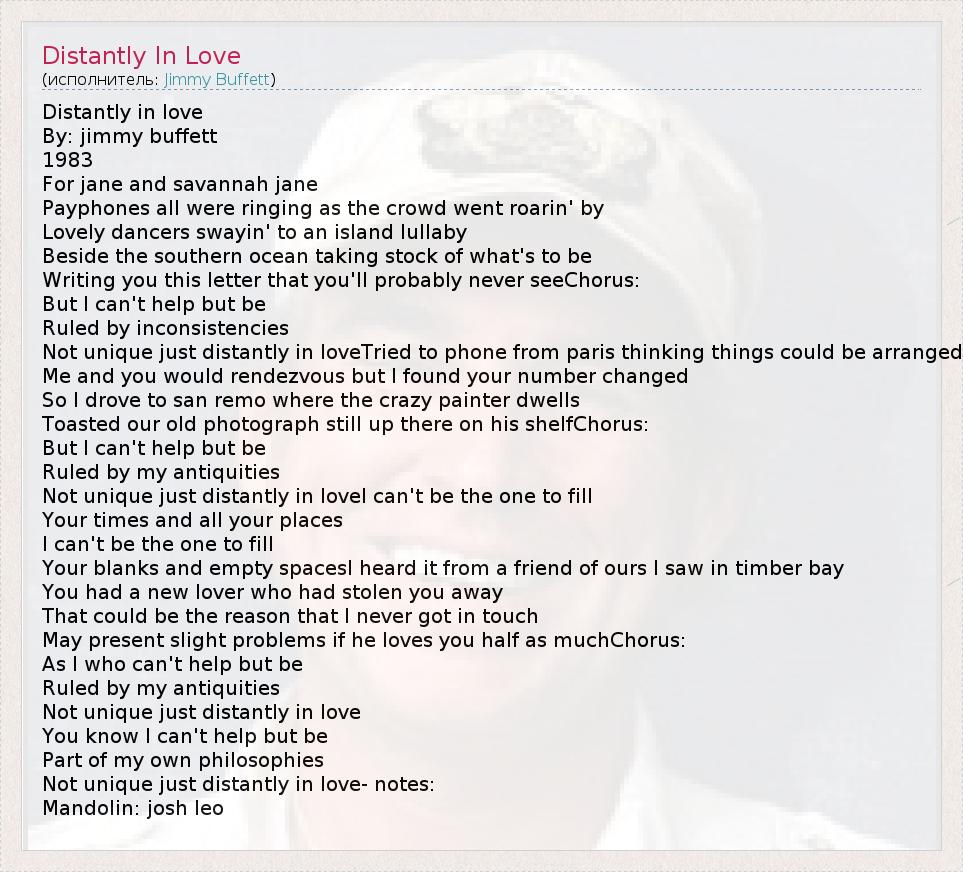 Distantly in love By: jimmy buffett 1983 For jane and savannah jane Payphones all were ringing as the crowd went roarin' by Lovely dancers swayin' to an island lullaby Beside the southern ocean taking stock of what's to be Writing you this letter that you'll probably never seeChorus: But I can't help but be Ruled by inconsistencies Not unique just distantly in loveTried to phone from paris thinking things could be arranged Me and you would rendezvous but I found your number changed So I drove to san remo where the crazy painter dwells Toasted our old photograph still up there on his shelfChorus: But I can't help but be Ruled by my antiquities Not unique just distantly in loveI can't be the one to fill Your times and all your places I can't be the one to fill Your blanks and empty spacesI heard it from a friend of ours I saw in timber bay You had a new lover who had stolen you away That could be the reason that I never got in touch May present slight problems if he loves you half as muchChorus: As I who can't help but be Ruled by my antiquities Not unique just distantly in love You know I can't help but be Part of my own philosophies Not unique just distantly in love- notes: Mandolin: josh leo
