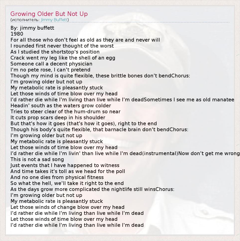 By: jimmy buffett 1980 For all those who don't feel as old as they are and never will I rounded first never thought of the worst As I studied the shortstop's position Crack went my leg like the shell of an egg Someone call a decent physician I'm no pete rose, I can't pretend Though my mind is quite flexible, these brittle bones don't bendChorus: I'm growing older but not up My metabolic rate is pleasantly stuck Let those winds of time blow over my head I'd rather die while I'm living than live while I'm deadSometimes I see me as old manatee Headin' south as the waters grow colder Tries to steer clear of the hum-drum so near It cuts prop scars deep in his shoulder But that's how it goes (that's how it goes), right to the end Though his body's quite flexible, that barnacle brain don't bendChorus: I'm growing older but not up My metabolic rate is pleasantly stuck Let those winds of time blow over my head I'd rather die while I'm livin' than live while I'm dead(instrumental)Now don't get me wrong This is not a sad song Just events that I have happened to witness And time takes it's toll as we head for the poll And no one dies from physical fitness So what the hell, we'll take it right to the end As the days grow more complicated the nightlife still winsChorus: I'm growing older but not up My metabolic rate is pleasantly stuck Let those winds of change blow over my head I'd rather die while I'm living than live while I'm dead Let those winds of time blow over my head I'd rather die while I'm living than live while I'm dead