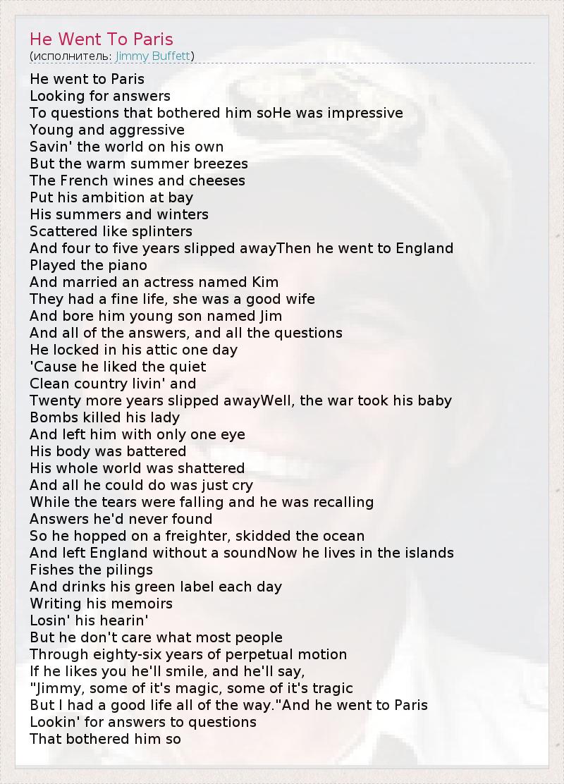 He went to Paris Looking for answers To questions that bothered him soHe was impressive Young and aggressive Savin' the world on his own But the warm summer breezes The French wines and cheeses Put his ambition at bay His summers and winters Scattered like splinters And four to five years slipped awayThen he went to England Played the piano And married an actress named Kim They had a fine life, she was a good wife And bore him young son named Jim And all of the answers, and all the questions He locked in his attic one day 'Cause he liked the quiet Clean country livin' and Twenty more years slipped awayWell, the war took his baby Bombs killed his lady And left him with only one eye His body was battered His whole world was shattered And all he could do was just cry While the tears were falling and he was recalling Answers he'd never found So he hopped on a freighter, skidded the ocean And left England without a soundNow he lives in the islands Fishes the pilings And drinks his green label each day Writing his memoirs Losin' his hearin' But he don't care what most people Through eighty-six years of perpetual motion If he likes you he'll smile, and he'll say, "Jimmy, some of it's magic, some of it's tragic But I had a good life all of the way."And he went to Paris Lookin' for answers to questions That bothered him so