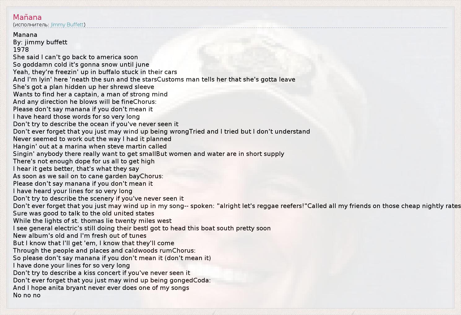 Manana By: jimmy buffett 1978 She said I can't go back to america soon So goddamn cold it's gonna snow until june Yeah, they're freezin' up in buffalo stuck in their cars And I'm lyin' here 'neath the sun and the starsCustoms man tells her that she's gotta leave She's got a plan hidden up her shrewd sleeve Wants to find her a captain, a man of strong mind And any direction he blows will be fineChorus: Please don't say manana if you don't mean it I have heard those words for so very long Don't try to describe the ocean if you've never seen it Don't ever forget that you just may wind up being wrongTried and I tried but I don't understand Never seemed to work out the way I had it planned Hangin' out at a marina when steve martin called Singin' anybody there really want to get smallBut women and water are in short supply There's not enough dope for us all to get high I hear it gets better, that's what they say As soon as we sail on to cane garden bayChorus: Please don't say manana if you don't mean it I have heard your lines for so very long Don't try to describe the scenery if you've never seen it Don't ever forget that you just may wind up in my song-- spoken: "alright let's reggae reefers!"Called all my friends on those cheap nightly rates Sure was good to talk to the old united states While the lights of st. thomas lie twenty miles west I see general electric's still doing their bestI got to head this boat south pretty soon New album's old and I'm fresh out of tunes But I know that I'll get 'em, I know that they'll come Through the people and places and caldwoods rumChorus: So please don't say manana if you don't mean it (don't mean it) I have done your lines for so very long Don't try to describe a kiss concert if you've never seen it Don't ever forget that you just may wind up being gongedCoda: And I hope anita bryant never ever does one of my songs No no no