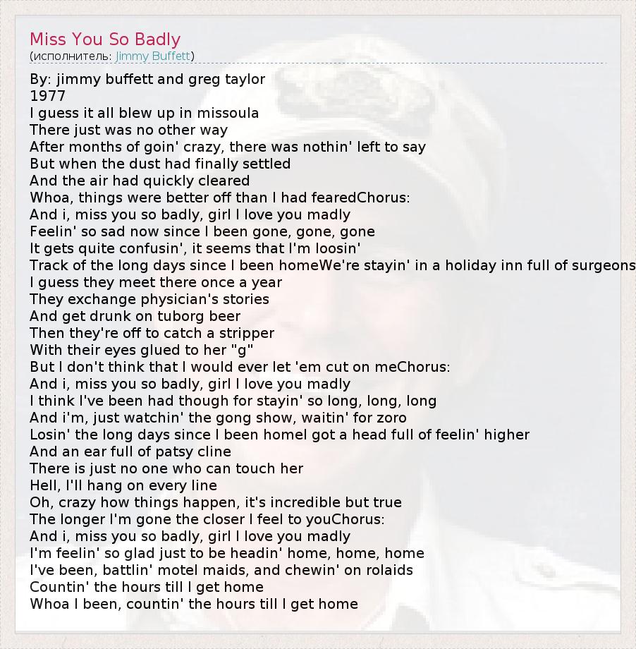 By: jimmy buffett and greg taylor 1977 I guess it all blew up in missoula There just was no other way After months of goin' crazy, there was nothin' left to say But when the dust had finally settled And the air had quickly cleared Whoa, things were better off than I had fearedChorus: And i, miss you so badly, girl I love you madly Feelin' so sad now since I been gone, gone, gone It gets quite confusin', it seems that I'm loosin' Track of the long days since I been homeWe're stayin' in a holiday inn full of surgeons I guess they meet there once a year They exchange physician's stories And get drunk on tuborg beer Then they're off to catch a stripper With their eyes glued to her "g" But I don't think that I would ever let 'em cut on meChorus: And i, miss you so badly, girl I love you madly I think I've been had though for stayin' so long, long, long And i'm, just watchin' the gong show, waitin' for zoro Losin' the long days since I been homeI got a head full of feelin' higher And an ear full of patsy cline There is just no one who can touch her Hell, I'll hang on every line Oh, crazy how things happen, it's incredible but true The longer I'm gone the closer I feel to youChorus: And i, miss you so badly, girl I love you madly I'm feelin' so glad just to be headin' home, home, home I've been, battlin' motel maids, and chewin' on rolaids Countin' the hours till I get home Whoa I been, countin' the hours till I get home