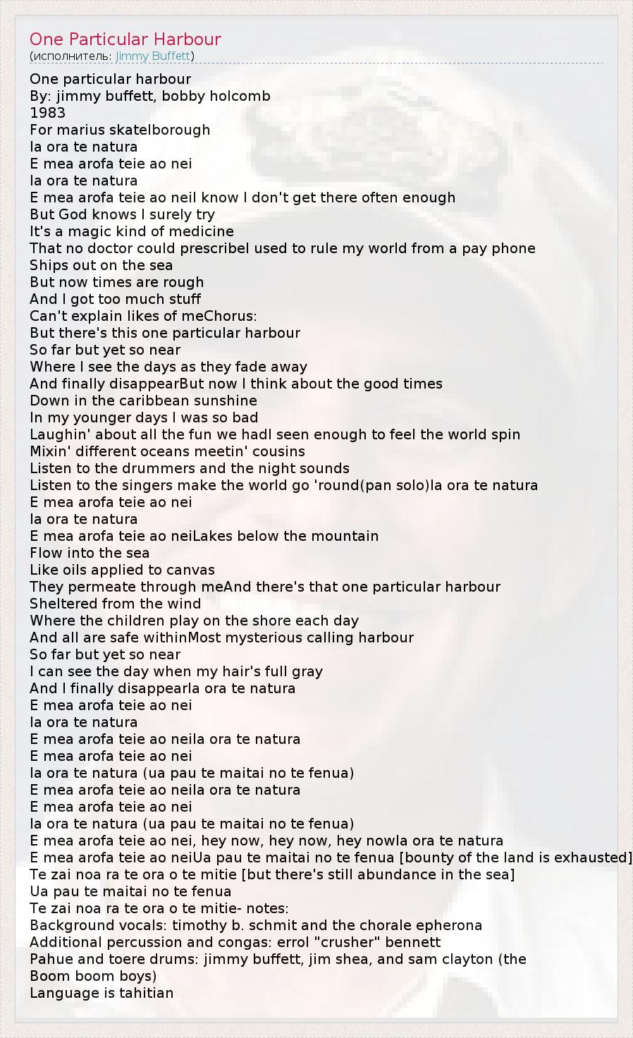 One particular harbour By: jimmy buffett, bobby holcomb 1983 For marius skatelborough Ia ora te natura E mea arofa teie ao nei Ia ora te natura E mea arofa teie ao neiI know I don't get there often enough But God knows I surely try It's a magic kind of medicine That no doctor could prescribeI used to rule my world from a pay phone Ships out on the sea But now times are rough And I got too much stuff Can't explain likes of meChorus: But there's this one particular harbour So far but yet so near Where I see the days as they fade away And finally disappearBut now I think about the good times Down in the caribbean sunshine In my younger days I was so bad Laughin' about all the fun we hadI seen enough to feel the world spin Mixin' different oceans meetin' cousins Listen to the drummers and the night sounds Listen to the singers make the world go 'round(pan solo)Ia ora te natura E mea arofa teie ao nei Ia ora te natura E mea arofa teie ao neiLakes below the mountain Flow into the sea Like oils applied to canvas They permeate through meAnd there's that one particular harbour Sheltered from the wind Where the children play on the shore each day And all are safe withinMost mysterious calling harbour So far but yet so near I can see the day when my hair's full gray And I finally disappearIa ora te natura E mea arofa teie ao nei Ia ora te natura E mea arofa teie ao neiIa ora te natura E mea arofa teie ao nei Ia ora te natura (ua pau te maitai no te fenua) E mea arofa teie ao neiIa ora te natura E mea arofa teie ao nei Ia ora te natura (ua pau te maitai no te fenua) E mea arofa teie ao nei, hey now, hey now, hey nowIa ora te natura E mea arofa teie ao neiUa pau te maitai no te fenua [bounty of the land is exhausted] Te zai noa ra te ora o te mitie [but there's still abundance in the sea] Ua pau te maitai no te fenua Te zai noa ra te ora o te mitie- notes: Background vocals: timothy b. schmit and the chorale epherona Additional percussion and congas: errol "crusher" bennett Pahue and toere drums: jimmy buffett, jim shea, and sam clayton (the Boom boom boys) Language is tahitian