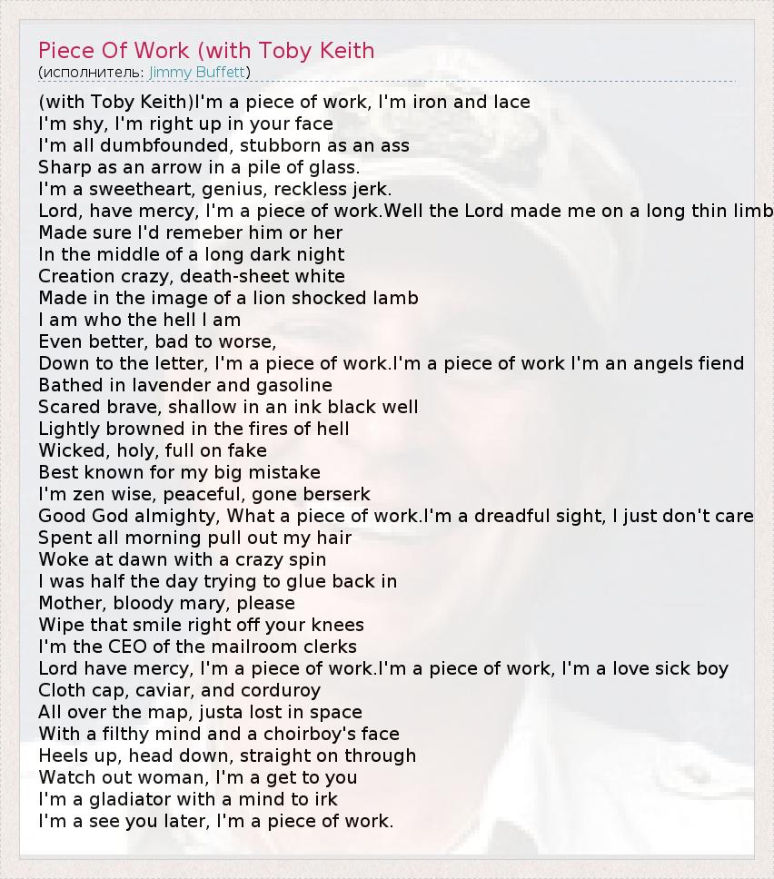 (with Toby Keith)I'm a piece of work, I'm iron and lace I'm shy, I'm right up in your face I'm all dumbfounded, stubborn as an ass Sharp as an arrow in a pile of glass. I'm a sweetheart, genius, reckless jerk. Lord, have mercy, I'm a piece of work.Well the Lord made me on a long thin limb Made sure I'd remeber him or her In the middle of a long dark night Creation crazy, death-sheet white Made in the image of a lion shocked lamb I am who the hell I am Even better, bad to worse, Down to the letter, I'm a piece of work.I'm a piece of work I'm an angels fiend Bathed in lavender and gasoline Scared brave, shallow in an ink black well Lightly browned in the fires of hell Wicked, holy, full on fake Best known for my big mistake I'm zen wise, peaceful, gone berserk Good God almighty, What a piece of work.I'm a dreadful sight, I just don't care Spent all morning pull out my hair Woke at dawn with a crazy spin I was half the day trying to glue back in Mother, bloody mary, please Wipe that smile right off your knees I'm the CEO of the mailroom clerks Lord have mercy, I'm a piece of work.I'm a piece of work, I'm a love sick boy Cloth cap, caviar, and corduroy All over the map, justa lost in space With a filthy mind and a choirboy's face Heels up, head down, straight on through Watch out woman, I'm a get to you I'm a gladiator with a mind to irk I'm a see you later, I'm a piece of work.