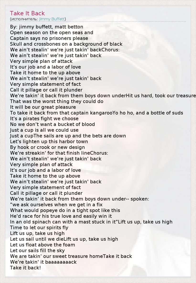 By: jimmy buffett, matt betton Open season on the open seas and Captain says no prisoners please Skull and crossbones on a background of black We ain't stealin' we're just takin' backChorus: We ain't stealin' we're just takin' back Very simple plan of attack It's our job and a labor of love Take it home to the up above We ain't stealin' we're just takin' back Very simple statement of fact Call it pillage or call it plunder We're takin' it back from them boys down underHit us hard, took our treasure That was the worst thing they could do It will be our great pleasure To take it back from that captain kangarooYo ho ho, and a bottle of suds It's a pirates fight we choose No we don't want a bucket of blood Just a cup is all we could use Just a cupThe sails are up and the bets are down Let's lighten up this harbor town By hook or crook or new design We're streakin' for that finish lineChorus: We ain't stealin' we're just takin' back Very simple plan of attack It's our job and a labor of love Take it home to the up above We ain't stealin' we're just takin' back Very simple statement of fact Call it pillage or call it plunder We're takin' it back from them boys down under-- spoken: "we ask ourselves when we get in a fix What would popeye do in a tight spot like this He'd race for his true love and easily win it In an old spinach can with a mast stuck in it"Lift us up, take us high Time to let our spirits fly Lift us up, take us high Let us sail until we dieLift us up, take us high Let us float above the foam Let our sails fill the sky We are takin' our sweet treasure homeTake it back We're takin' it baaaaaaaack Take it back!