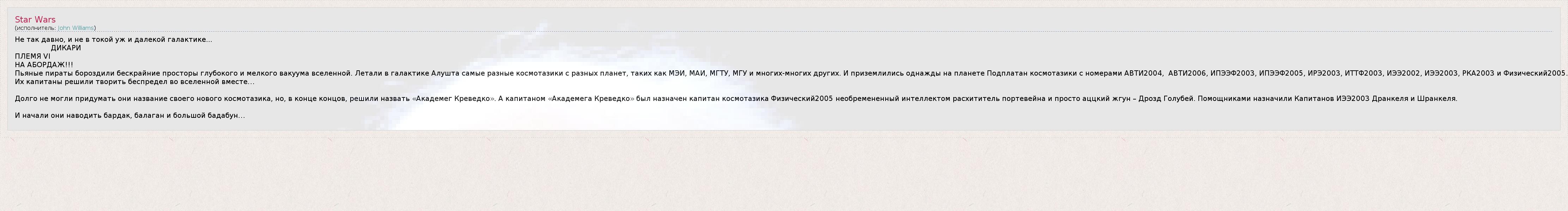 Пьяные пираты бороздили бескрайние просторы глубокого и мелкого вакуума вселенной. Летали в галактике Алушта самые разные космотазики с разных планет, таких как МЭИ, МАИ, МГТУ, МГУ и многих-многих других. И приземлились однажды на планете Подплатан космотазики с номерами АВТИ2004, АВТИ2006, ИПЭЭФ2003, ИПЭЭФ2005, ИРЭ2003, ИТТФ2003, ИЭЭ2002, ИЭЭ2003, РКА2003 и Физический2005.
