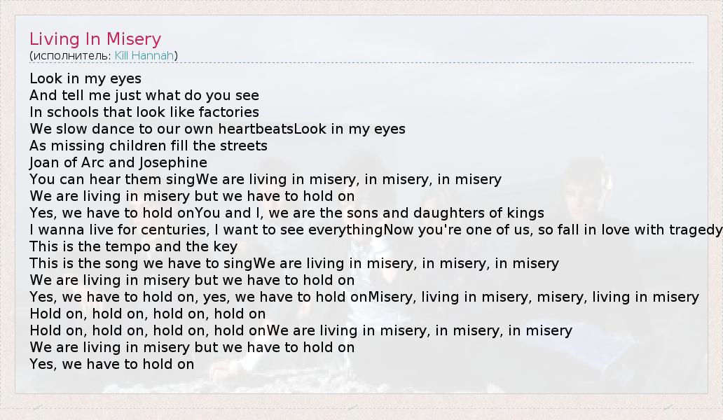 Look in my eyes And tell me just what do you see In schools that look like factories We slow dance to our own heartbeatsLook in my eyes As missing children fill the streets Joan of Arc and Josephine You can hear them singWe are living in misery, in misery, in misery We are living in misery but we have to hold on Yes, we have to hold onYou and I, we are the sons and daughters of kings I wanna live for centuries, I want to see everythingNow you're one of us, so fall in love with tragedy This is the tempo and the key This is the song we have to singWe are living in misery, in misery, in misery We are living in misery but we have to hold on Yes, we have to hold on, yes, we have to hold onMisery, living in misery, misery, living in misery Hold on, hold on, hold on, hold on Hold on, hold on, hold on, hold onWe are living in misery, in misery, in misery We are living in misery but we have to hold on Yes, we have to hold on