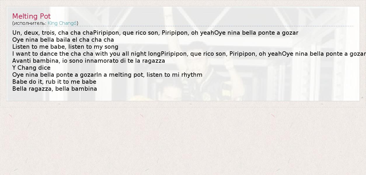 Un, deux, trois, cha cha chaPiripipon, que rico son, Piripipon, oh yeahOye nina bella ponte a gozar Oye nina bella baila el cha cha cha Listen to me babe, listen to my song I want to dance the cha cha with you all night longPiripipon, que rico son, Piripipon, oh yeahOye nina bella ponte a gozar Avanti bambina, io sono innamorato di te la ragazza Y Chang dice Oye nina bella ponte a gozarIn a melting pot, listen to mi rhythm Babe do it, rub it to me babe Bella ragazza, bella bambina