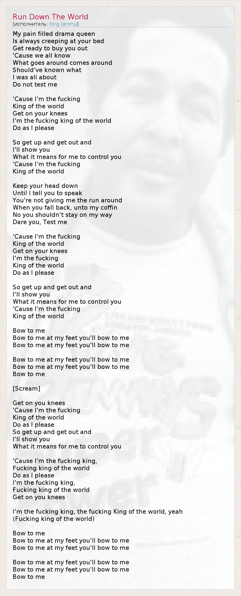 Моя страдающая королева трагедии Всегда ползает по твой постели. Приготовься выкупать себя, Ведь все мы знаем, что Как аукнется, так и откликнется. Тебе следовало знать, Что я за всем этим стою, Не нужно меня испытывать. Да я, блин, Король мира! На колени! Да я, блин, король мира! Делай, как я пожелаю. Так что вставай и проваливай, И я покажу, как это - Быть под моим контролем. Да я, блин, Король мира! Пригибай голову, Пока я не разрешу говорить. И не смей меня дурачить. Когда ты отступаешь назад к моему гробу, Лучше не попадайся мне на глаза! Давай, попробуй испытать меня. Да я, блин, Король мира! На колени! Да я блин, Король мира! Делай, как я пожелаю. Так что вставай и проваливай, И я покажу, как это - Быть под моим контролем. Да я, блин, Король мира! Кланяйся мне, Кланяйся мне в ноги, ты поклонишься мне! Кланяйся мне в ноги, ты поклонишься мне! Кланяйся мне, кланяйся мне в ноги, Ты поклонишься мне! Кланяйся мне в ноги, Ты поклонишься мне! [Крик] На колени! Да я, блин, Король мира! Делай, как я пожелаю. Так что вставай и проваливай, И я покажу, как это - Быть под моим контролем. Да я, блин, король, Да я, блин, король мира! Делай, как я пожелаю. Да я, блин, король, Да я, блин, король мира! На колени! Да я, блин, король, да я, блин, король мира, да! (Король мира, блин) Кланяйся мне, Кланяйся мне в ноги, ты поклонишься мне! Кланяйся мне в ноги, Ты поклонишься мне! Кланяйся мне, кланяйся мне в ноги, Ты поклонишься мне! Кланяйся мне в ноги, Ты поклонишься мне!