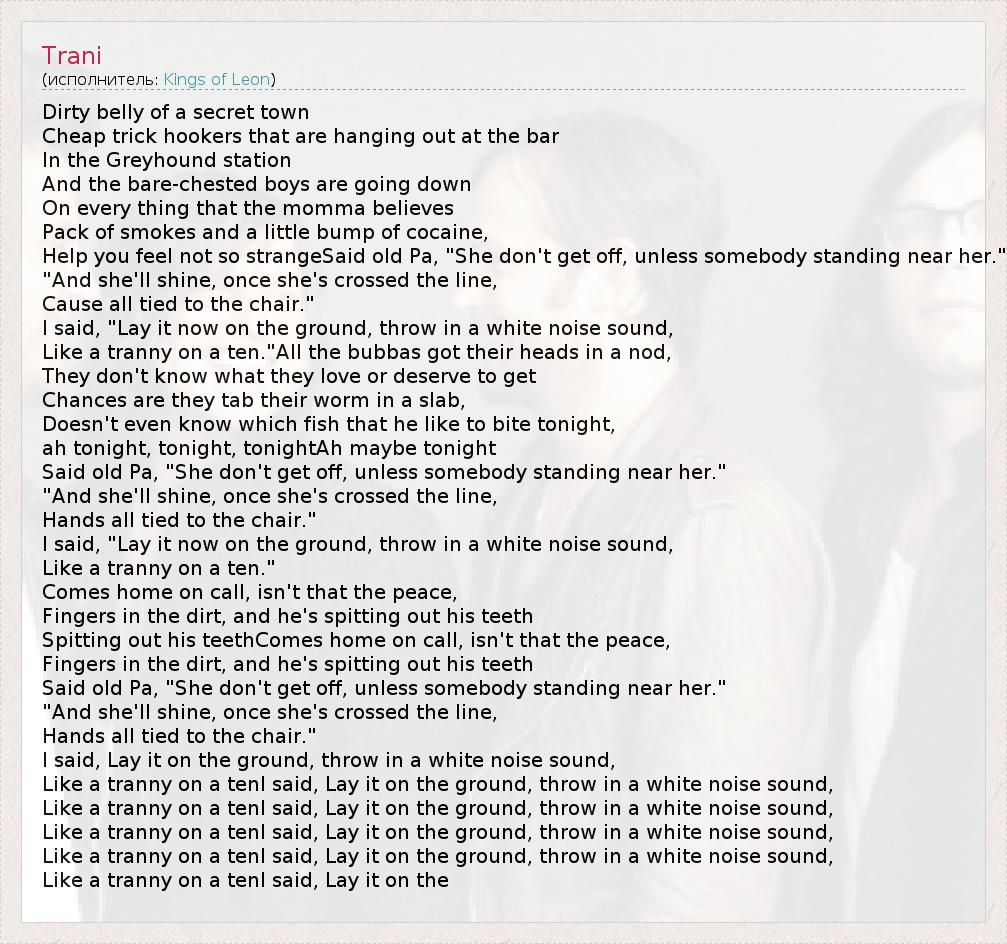 Like a tranny on a tenI said, Lay it on the