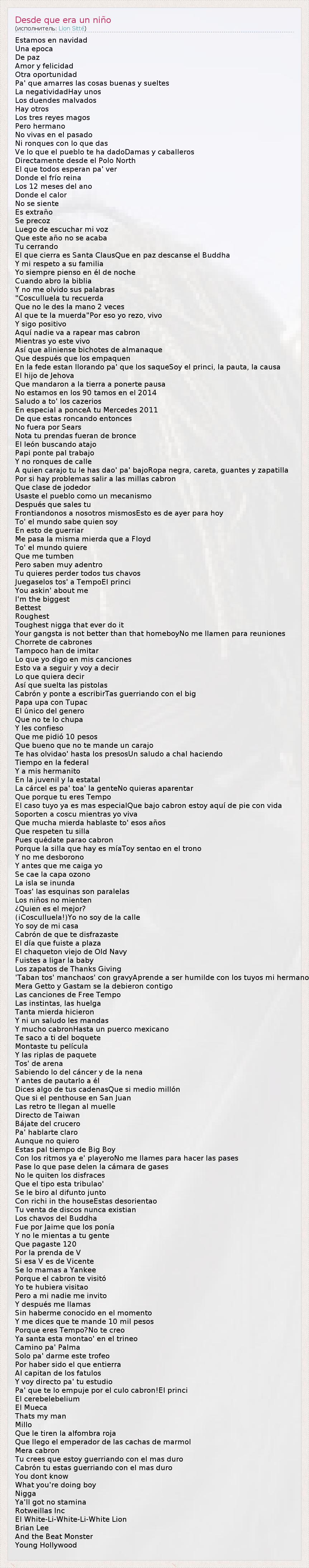 Estamos en navidad Una epoca De paz Amor y felicidad Otra oportunidad Pa' que amarres las cosas buenas y sueltes La negatividadHay unos Los duendes malvados Hay otros Los tres reyes magos Pero hermano No vivas en el pasado Ni ronques con lo que das Ve lo que el pueblo te ha dadoDamas y caballeros Directamente desde el Polo North El que todos esperan pa' ver Donde el frío reina Los 12 meses del ano Donde el calor No se siente Es extraño Se precoz Luego de escuchar mi voz Que este año no se acaba Tu cerrando El que cierra es Santa ClausQue en paz descanse el Buddha Y mi respeto a su familia Yo siempre pienso en él de noche Cuando abro la biblia Y no me olvido sus palabras "Cosculluela tu recuerda Que no le des la mano 2 veces Al que te la muerda"Por eso yo rezo, vivo Y sigo positivo Aquí nadie va a rapear mas cabron Mientras yo este vivo Así que aliniense bichotes de almanaque Que después que los empaquen En la fede estan llorando pa' que los saqueSoy el princi, la pauta, la causa El hijo de Jehova Que mandaron a la tierra a ponerte pausa No estamos en los 90 tamos en el 2014 Saludo a to' los cazerios En especial a ponceA tu Mercedes 2011 De que estas roncando entonces No fuera por Sears Nota tu prendas fueran de bronce El león buscando atajo Papi ponte pal trabajo Y no ronques de calle A quien carajo tu le has dao' pa' bajoRopa negra, careta, guantes y zapatilla Por si hay problemas salir a las millas cabron Que clase de jodedor Usaste el pueblo como un mecanismo Después que sales tu Frontiandonos a nosotros mismosEsto es de ayer para hoy To' el mundo sabe quien soy En esto de guerriar Me pasa la misma mierda que a Floyd To' el mundo quiere Que me tumben Pero saben muy adentro Tu quieres perder todos tus chavos Juegaselos tos' a TempoEl princi You askin' about me I'm the biggest Bettest Roughest Toughest nigga that ever do it Your gangsta is not better than that homeboyNo me llamen para reuniones Chorrete de cabrones Tampoco han de imitar Lo que yo digo en mis canciones Esto va a seguir y voy a decir Lo que quiera decir Así que suelta las pistolas Cabrón y ponte a escribirTas guerriando con el big Papa upa con Tupac El único del genero Que no te lo chupa Y les confieso Que me pidió 10 pesos Que bueno que no te mande un carajo Te has olvidao' hasta los presosUn saludo a chal haciendo Tiempo en la federal Y a mis hermanito En la juvenil y la estatal La cárcel es pa' toa' la genteNo quieras aparentar Que porque tu eres Tempo El caso tuyo ya es mas especialQue bajo cabron estoy aquí de pie con vida Soporten a coscu mientras yo viva Que mucha mierda hablaste to' esos años Que respeten tu silla Pues quédate parao cabron Porque la silla que hay es míaToy sentao en el trono Y no me desborono Y antes que me caiga yo Se cae la capa ozono La isla se inunda Toas' las esquinas son paralelas Los niños no mienten ¿Quien es el mejor? (¡Cosculluela!)Yo no soy de la calle Yo soy de mi casa Cabrón de que te disfrazaste El día que fuiste a plaza El chaqueton viejo de Old Navy Fuistes a ligar la baby Los zapatos de Thanks Giving 'Taban tos' manchaos' con gravyAprende a ser humilde con los tuyos mi hermano Mera Getto y Gastam se la debieron contigo Las canciones de Free Tempo Las instintas, las huelga Tanta mierda hicieron Y ni un saludo les mandas Y mucho cabronHasta un puerco mexicano Te saco a ti del boquete Montaste tu película Y las riplas de paquete Tos' de arena Sabiendo lo del cáncer y de la nena Y antes de pautarlo a él Dices algo de tus cadenasQue si medio millón Que si el penthouse en San Juan Las retro te llegan al muelle Directo de Taiwan Bájate del crucero Pa' hablarte claro Aunque no quiero Estas pal tiempo de Big Boy Con los ritmos ya e' playeroNo me llames para hacer las pases Pase lo que pase delen la cámara de gases No le quiten los disfraces Que el tipo esta tribulao' Se le biro al difunto junto Con richi in the houseEstas desorientao Tu venta de discos nunca existian Los chavos del Buddha Fue por Jaime que los ponía Y no le mientas a tu gente Que pagaste 120 Por la prenda de V Si esa V es de Vicente Se lo mamas a Yankee Porque el cabron te visitó Yo te hubiera visitao Pero a mi nadie me invito Y después me llamas Sin haberme conocido en el momento Y me dices que te mande 10 mil pesos Porque eres Tempo?No te creo Ya santa esta montao' en el trineo Camino pa' Palma Solo pa' darme este trofeo Por haber sido el que entierra Al capitan de los fatulos Y voy directo pa' tu estudio Pa' que te lo empuje por el culo cabron!El princi El cerebelebelium El Mueca Thats my man Millo Que le tiren la alfombra roja Que llego el emperador de las cachas de marmol Mera cabron Tu crees que estoy guerriando con el mas duro Cabrón tu estas guerriando con el mas duro You dont know What you're doing boy Nigga Ya'll got no stamina Rotweillas Inc El White-Li-White-Li-White Lion Brian Lee And the Beat Monster Young Hollywood