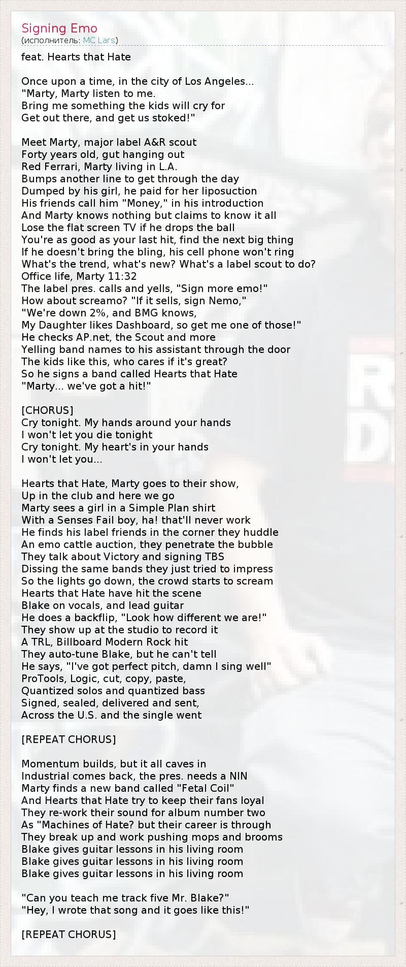 А как ты думаешь, о чем песня "Signing Emo" ?