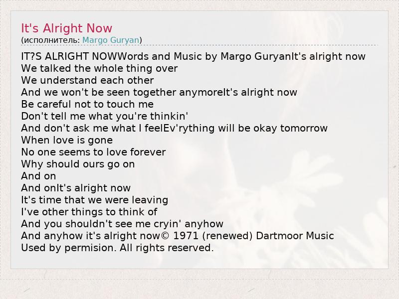 IT?S ALRIGHT NOWWords and Music by Margo GuryanIt's alright now We talked the whole thing over We understand each other And we won't be seen together anymoreIt's alright now Be careful not to touch me Don't tell me what you're thinkin' And don't ask me what I feelEv'rything will be okay tomorrow When love is gone No one seems to love forever Why should ours go on And on And onIt's alright now It's time that we were leaving I've other things to think of And you shouldn't see me cryin' anyhow And anyhow it's alright now© 1971 (renewed) Dartmoor Music Used by permision. All rights reserved.