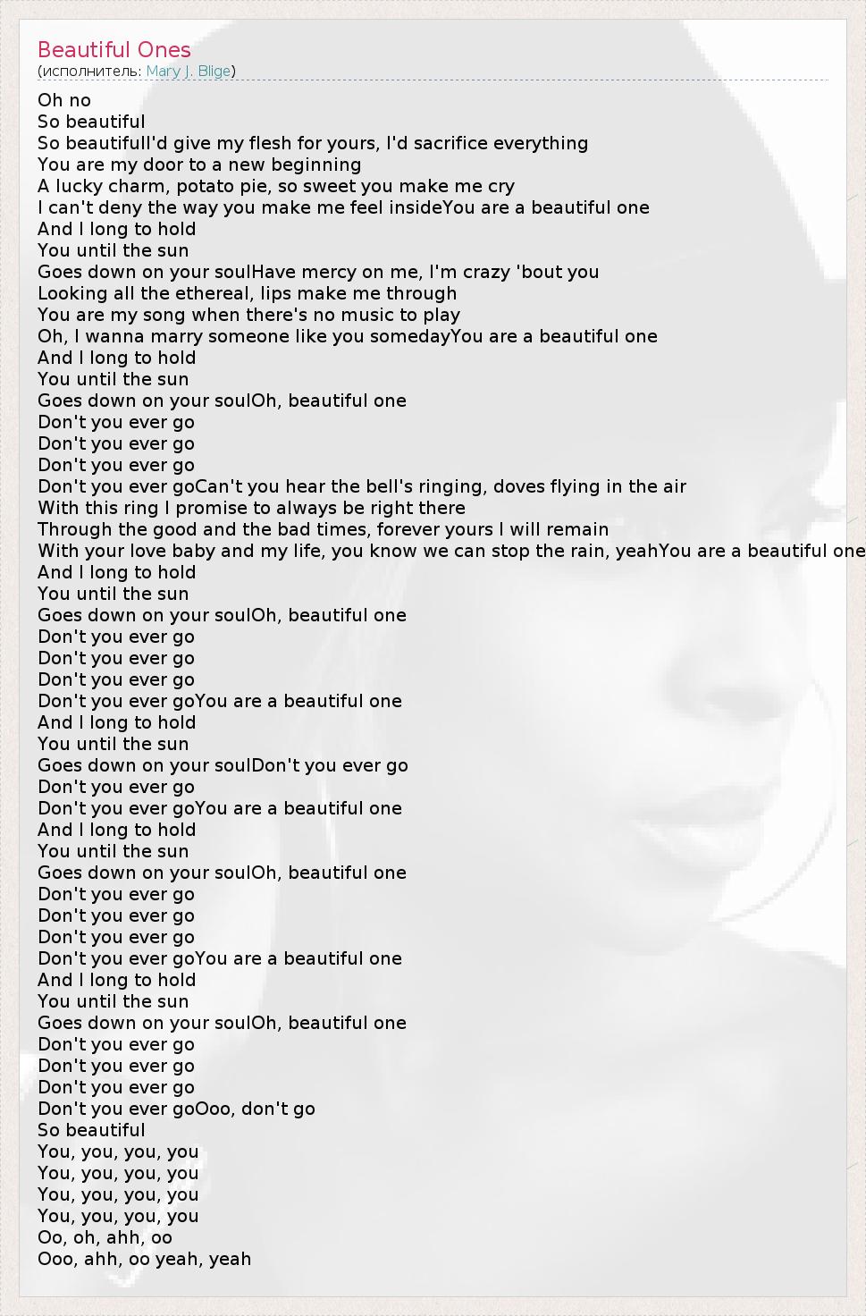 Oh no So beautiful So beautifulI'd give my flesh for yours, I'd sacrifice everything You are my door to a new beginning A lucky charm, potato pie, so sweet you make me cry I can't deny the way you make me feel insideYou are a beautiful one And I long to hold You until the sun Goes down on your soulHave mercy on me, I'm crazy 'bout you Looking all the ethereal, lips make me through You are my song when there's no music to play Oh, I wanna marry someone like you somedayYou are a beautiful one And I long to hold You until the sun Goes down on your soulOh, beautiful one Don't you ever go Don't you ever go Don't you ever go Don't you ever goCan't you hear the bell's ringing, doves flying in the air With this ring I promise to always be right there Through the good and the bad times, forever yours I will remain With your love baby and my life, you know we can stop the rain, yeahYou are a beautiful one And I long to hold You until the sun Goes down on your soulOh, beautiful one Don't you ever go Don't you ever go Don't you ever go Don't you ever goYou are a beautiful one And I long to hold You until the sun Goes down on your soulDon't you ever go Don't you ever go Don't you ever goYou are a beautiful one And I long to hold You until the sun Goes down on your soulOh, beautiful one Don't you ever go Don't you ever go Don't you ever go Don't you ever goYou are a beautiful one And I long to hold You until the sun Goes down on your soulOh, beautiful one Don't you ever go Don't you ever go Don't you ever go Don't you ever goOoo, don't go So beautiful You, you, you, you You, you, you, you You, you, you, you You, you, you, you Oo, oh, ahh, oo Ooo, ahh, oo yeah, yeah