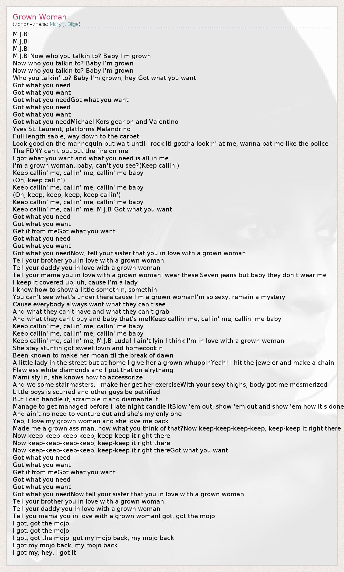 M.J.B! M.J.B! M.J.B! M.J.B!Now who you talkin to? Baby I'm grown Now who you talkin to? Baby I'm grown Now who you talkin to? Baby I'm grown Who you talkin' to? Baby I'm grown, hey!Got what you want Got what you need Got what you want Got what you needGot what you want Got what you need Got what you want Got what you needMichael Kors gear on and Valentino Yves St. Laurent, platforms Malandrino Full length sable, way down to the carpet Look good on the mannequin but wait until I rock itI gotcha lookin' at me, wanna pat me like the police The FDNY can't put out the fire on me I got what you want and what you need is all in me I'm a grown woman, baby, can't you see?(Keep callin') Keep callin' me, callin' me, callin' me baby (Oh, keep callin') Keep callin' me, callin' me, callin' me baby (Oh, keep, keep, keep, keep callin') Keep callin' me, callin' me, callin' me baby Keep callin' me, callin' me, M.J.B!Got what you want Got what you need Got what you want Get it from meGot what you want Got what you need Got what you want Got what you needNow, tell your sister that you in love with a grown woman Tell your brother you in love with a grown woman Tell your daddy you in love with a grown woman Tell your mama you in love with a grown womanI wear these Seven jeans but baby they don't wear me I keep it covered up, uh, cause I'm a lady I know how to show a little somethin, somethin You can't see what's under there cause I'm a grown womanI'm so sexy, remain a mystery Cause everybody always want what they can't see And what they can't have and what they can't grab And what they can't buy and baby that's me!Keep callin' me, callin' me, callin' me baby Keep callin' me, callin' me, callin' me baby Keep callin' me, callin' me, callin' me baby Keep callin' me, callin' me, M.J.B!Luda! I ain't lyin I think I'm in love with a grown woman She stay stuntin got sweet lovin and homecookin Been known to make her moan til the break of dawn A little lady in the street but at home I give her a grown whuppinYeah! I hit the jeweler and make a chain Flawless white diamonds and I put that on e'rythang Mami stylin, she knows how to accessorize And we some stairmasters, I make her get her exerciseWith your sexy thighs, body got me mesmerized Little boys is scurred and other guys be petrified But I can handle it, scramble it and dismantle it Manage to get managed before I late night candle itBlow 'em out, show 'em out and show 'em how it's done And ain't no need to venture out and she's my only one Yep, I love my grown woman and she love me back Made me a grown ass man, now what you think of that?Now keep-keep-keep-keep, keep-keep it right there Now keep-keep-keep-keep, keep-keep it right there Now keep-keep-keep-keep, keep-keep it right there Now keep-keep-keep-keep, keep-keep it right thereGot what you want Got what you need Got what you want Get it from meGot what you want Got what you need Got what you want Got what you needNow tell your sister that you in love with a grown woman Tell your brother you in love with a grown woman Tell your daddy you in love with a grown woman Tell you mama you in love with a grown womanI got, got the mojo I got, got the mojo I got, got the mojo I got, got the mojoI got my mojo back, my mojo back I got my mojo back, my mojo back I got my, hey, I got it