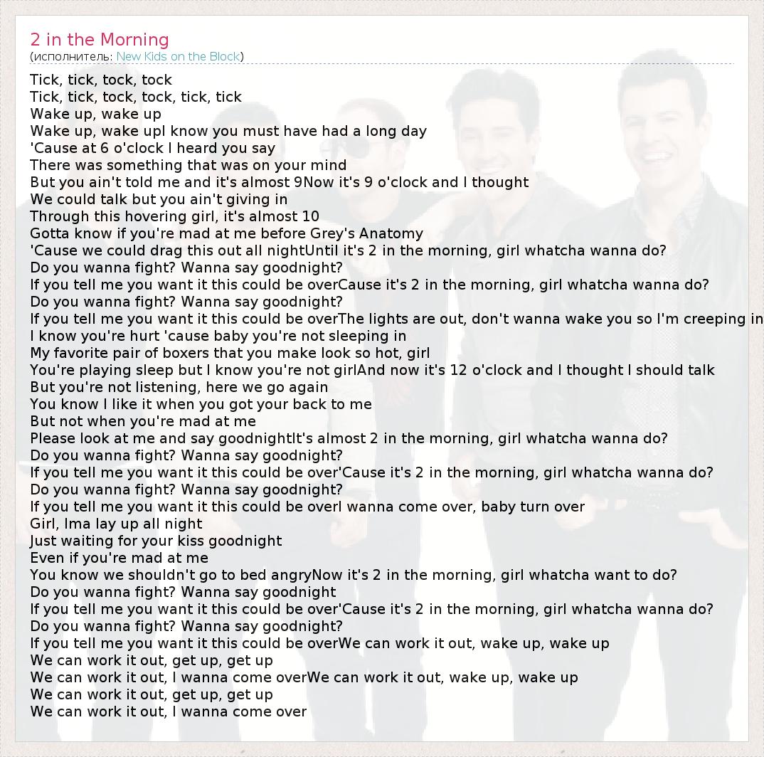 Tick, tick, tock, tock Tick, tick, tock, tock, tick, tick Wake up, wake up Wake up, wake upI know you must have had a long day 'Cause at 6 o'clock I heard you say There was something that was on your mind But you ain't told me and it's almost 9Now it's 9 o'clock and I thought We could talk but you ain't giving in Through this hovering girl, it's almost 10 Gotta know if you're mad at me before Grey's Anatomy 'Cause we could drag this out all nightUntil it's 2 in the morning, girl whatcha wanna do? Do you wanna fight? Wanna say goodnight? If you tell me you want it this could be overCause it's 2 in the morning, girl whatcha wanna do? Do you wanna fight? Wanna say goodnight? If you tell me you want it this could be overThe lights are out, don't wanna wake you so I'm creeping in I know you're hurt 'cause baby you're not sleeping in My favorite pair of boxers that you make look so hot, girl You're playing sleep but I know you're not girlAnd now it's 12 o'clock and I thought I should talk But you're not listening, here we go again You know I like it when you got your back to me But not when you're mad at me Please look at me and say goodnightIt's almost 2 in the morning, girl whatcha wanna do? Do you wanna fight? Wanna say goodnight? If you tell me you want it this could be over'Cause it's 2 in the morning, girl whatcha wanna do? Do you wanna fight? Wanna say goodnight? If you tell me you want it this could be overI wanna come over, baby turn over Girl, Ima lay up all night Just waiting for your kiss goodnight Even if you're mad at me You know we shouldn't go to bed angryNow it's 2 in the morning, girl whatcha want to do? Do you wanna fight? Wanna say goodnight If you tell me you want it this could be over'Cause it's 2 in the morning, girl whatcha wanna do? Do you wanna fight? Wanna say goodnight? If you tell me you want it this could be overWe can work it out, wake up, wake up We can work it out, get up, get up We can work it out, I wanna come overWe can work it out, wake up, wake up We can work it out, get up, get up We can work it out, I wanna come over